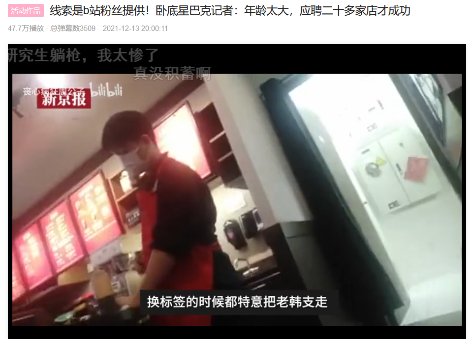 而新闻中,店员环顾四周确认没顾客后,给食材更换标签的片段,也是费了一些力气才拍到的。记者在视频中表示,和之前卧底过的一些地方相比,星巴克员工的警惕性比较高,一周过去老韩也并没有融入那个圈子,换标签也会支开老韩。