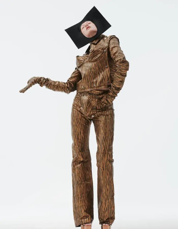 此系列以雕塑为起始灵感,通过将各种身体结构的混合穿插和一次次让身体跳出原本肢体框架的结构实验,最后创造出穿着“身体”的新方式。而主题“Frames”也正有影视画面或框架的意思,不断出现的方形头饰以及方块状的服装廓形就像是影像的框架,而模特扭曲的身姿也正有突破框架和束缚的意味。