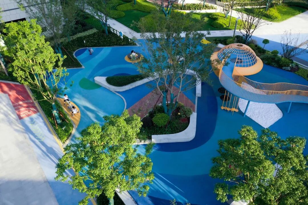 灌木饱满如云,场地绿意横生,折线道路将视线引至童趣空间。我们在儿童场地边缘设计半围合的草坡微地形,一定程度上遮挡视线,提升景观趣味性,达到“一步异景”的景观效果。