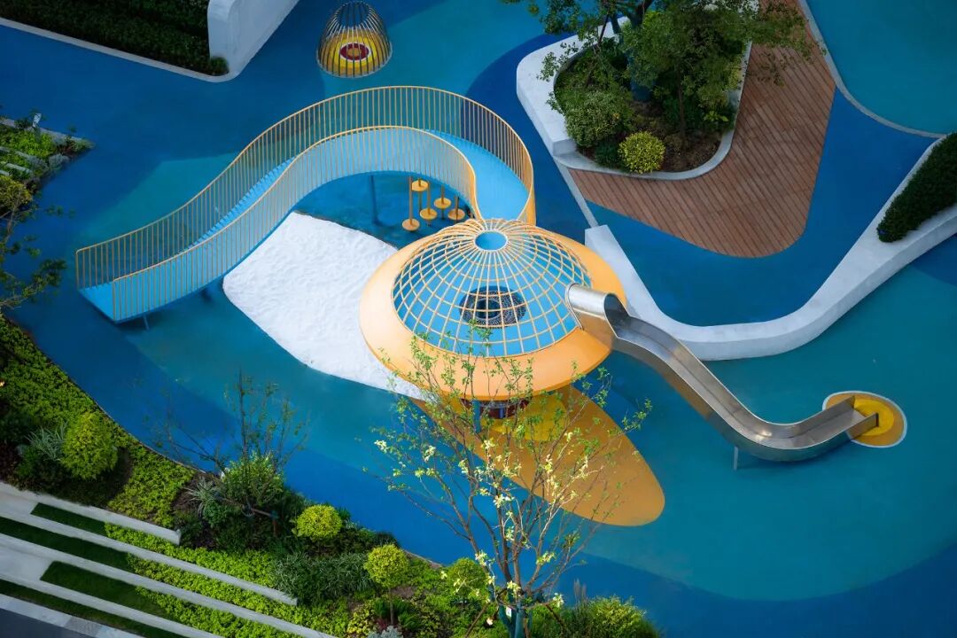 树影浮动,设计把游乐场地带到自然中,使野趣与童趣结合碰撞,并将各式各样的的互动装置于场地:时空隧道、UFO滑梯、杠杆翘板…满足不同年龄段的儿童活动需求。