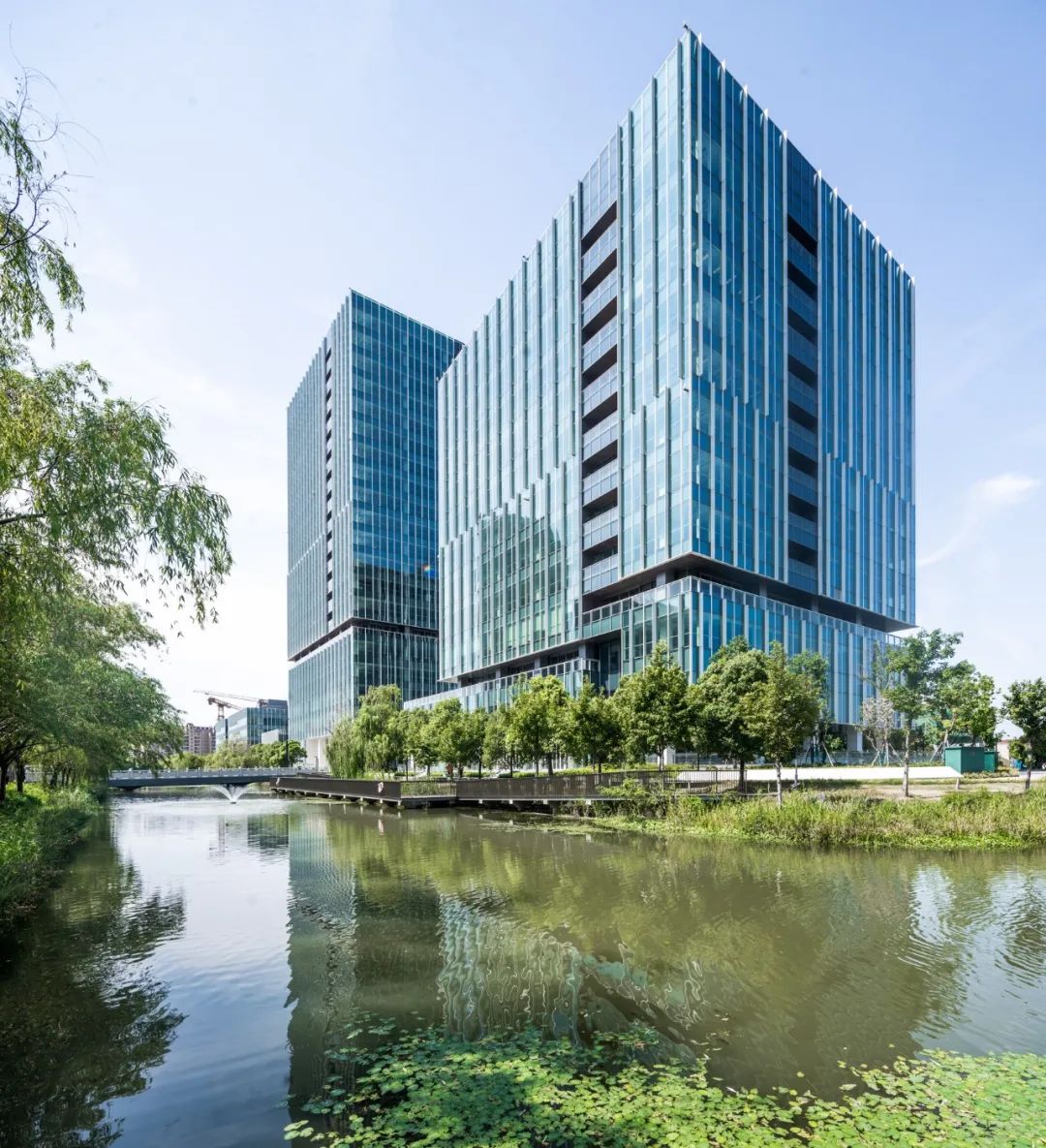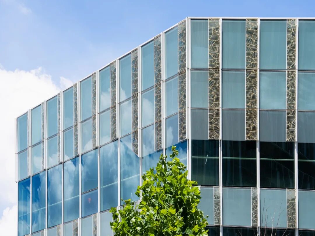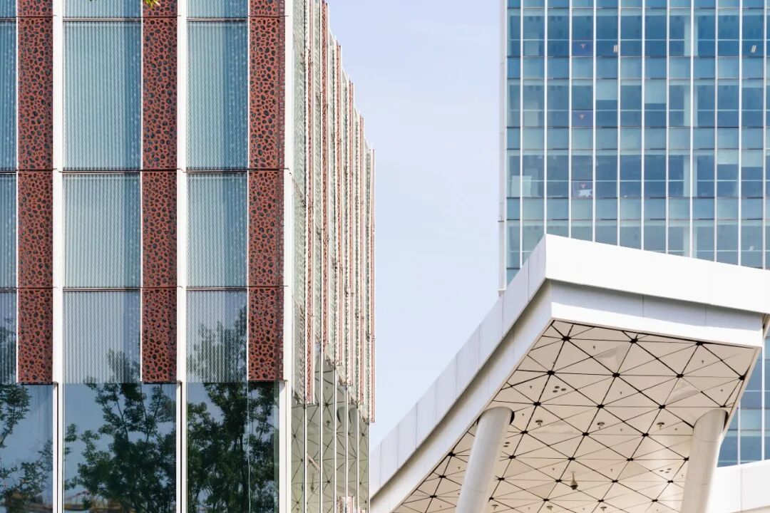 设计团队在整体体量划分上兼顾实用与美学要求,独栋商业建筑设计为动感的不规则多边形体,而办公楼则采用高效规整的四边形体,建筑立面统一采用垂直百叶这一设计元素,保持项目的整体感。独栋建筑采用兰、樱、竹三个不同主题的穿孔图案,区分不同的功能与空间的同时,形成都市丛林的整体感。