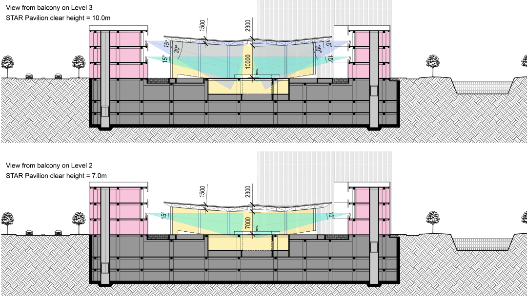 设计团队联合顾问团队通过综合性的高度及视线分析、微气候模拟、结构和单元优化、材料反射分析、综合吊顶天花系统、噪音监控系统等应用,将“星幕”的多场景功能发挥到极致。