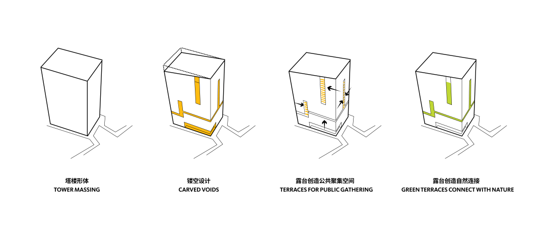 根据Gensler多年的办公研究成果,亲自然性以及室外空间的可达性将成为未来办公设计的重要趋势。设计团队通过打开建筑立面,形成垂直及水平维度的开放阳台以及屋顶露台,为租户提供丰富的室外亲自然空间,增加租户互动交流的机会以促进创新,将自然光线及新鲜的空气引入室内空间,同时丰富立面肌理。商业以及办公楼首层采用全开启的的折叠门,可在天气情况适合的时间完全打开,将室内室外空间融为一体 。