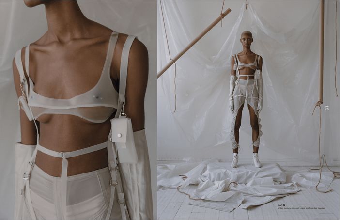 本期介绍的新锐设计师,来自帕森斯设计师学院的毕业生Elena Velez亦在其设计创作中表达了工业风时装带来的独特魅力。