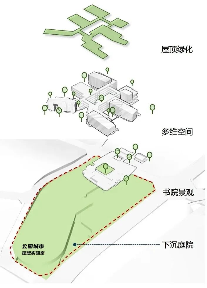 设计师利用学校高差将图书馆、报告厅、运动场等此类共享性较强的空间集中布置,便于社区开放时的管理。