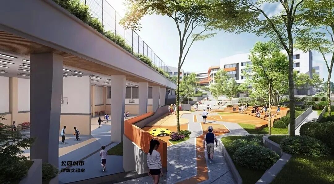 在学校的南北向,设计师利用中庭将北侧自然风光引入校园,并延申至学校操场;在校园东侧沿鹿溪河打造景观退台,为学生创造出一片良好的景观视野。