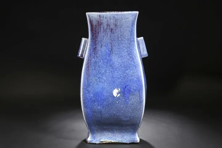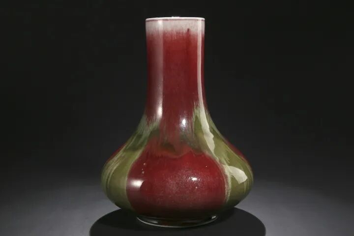 窑变釉是雍正朝仿钧窑时创新的品种,以雍、乾二朝制品为佳,釉色以红为主,交融流淌着天蓝、月白、绿、褐等杂色,犹如火焰般万紫千红,其中偏红的称“火焰红”、偏蓝的称“火焰青”。