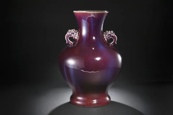 描述:保真卡号:338881 此件清中·窑变釉兽耳尊,通体满施窑变釉,釉色间有红、紫、蓝等色,深沉古朴,釉面光润。窑变流淌自然,变幻莫测,极为美艳,具有明显的时代特征,其造型取自先秦青铜器,造型浑厚古朴,端壮周正,为陈设之重器,亦为同期窑变釉瓷器中翘楚。