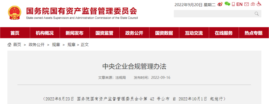 据国资委官网消息,近日,国务院国资委印发《中央企业合规管理办法》,推动中央企业加强合规管理,切实防控风险,有力保障深化改革与高质量发展。