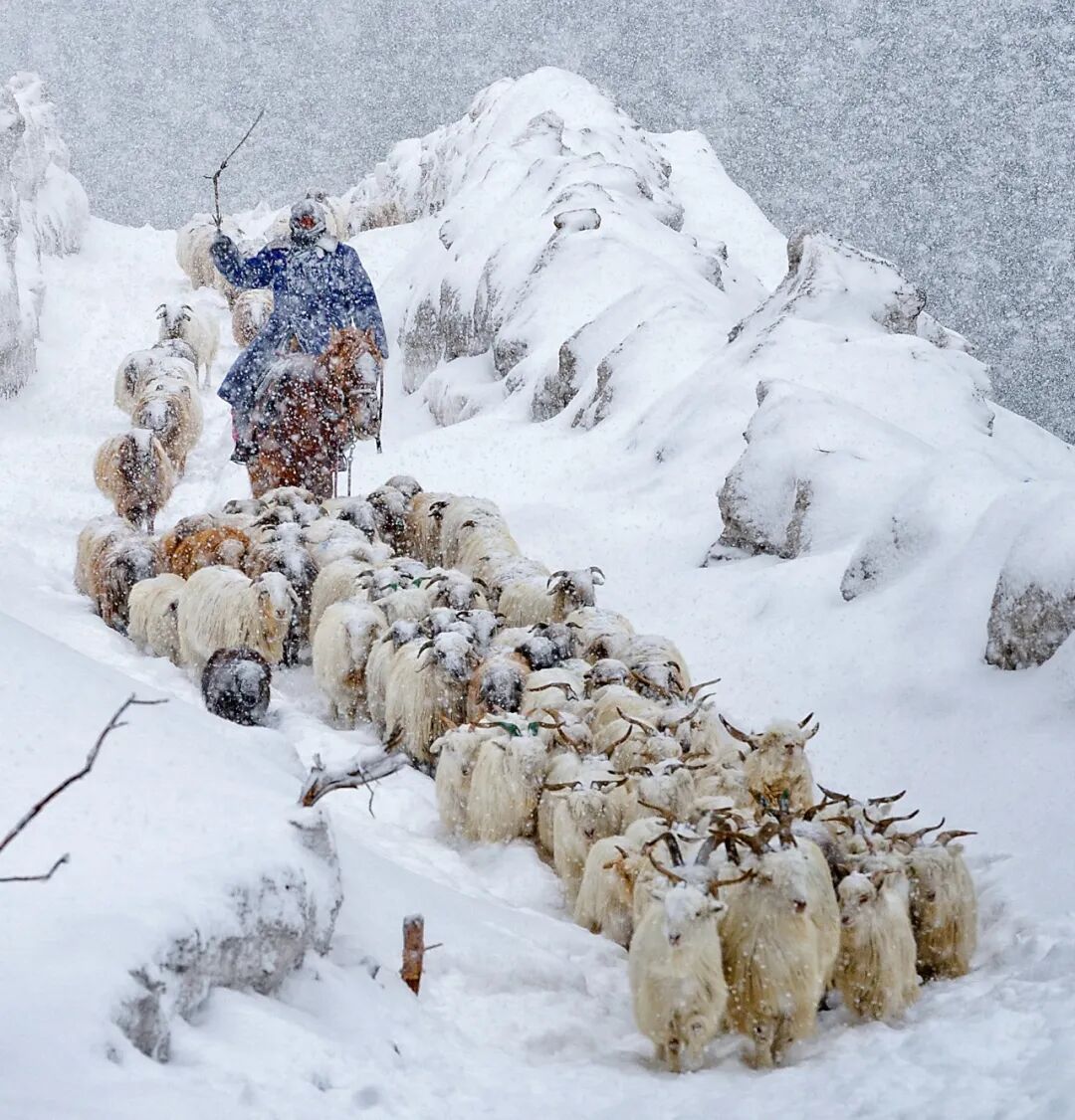 ▲ 果子沟里的牧民正冒着风雪前行。图/《丝绸之路》,摄影/赖宇宁