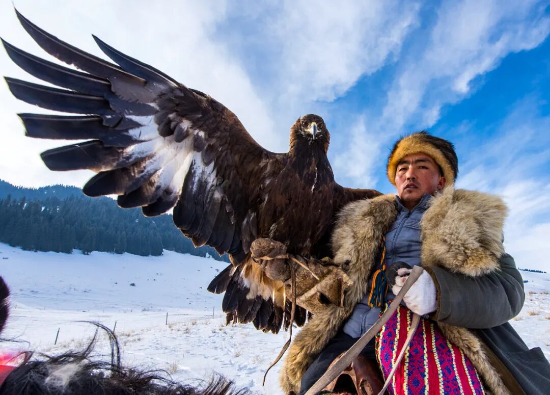 ▲ 哈萨克牧民的鹰。游牧民族大多崇拜鹰隼,维吾尔族古称回鹘,鹘就是鹰隼的一种。图/《丝绸之路》,摄影/秦