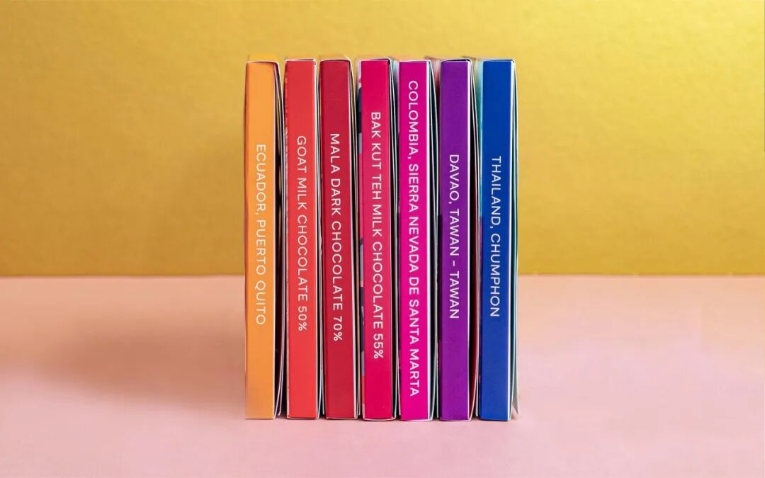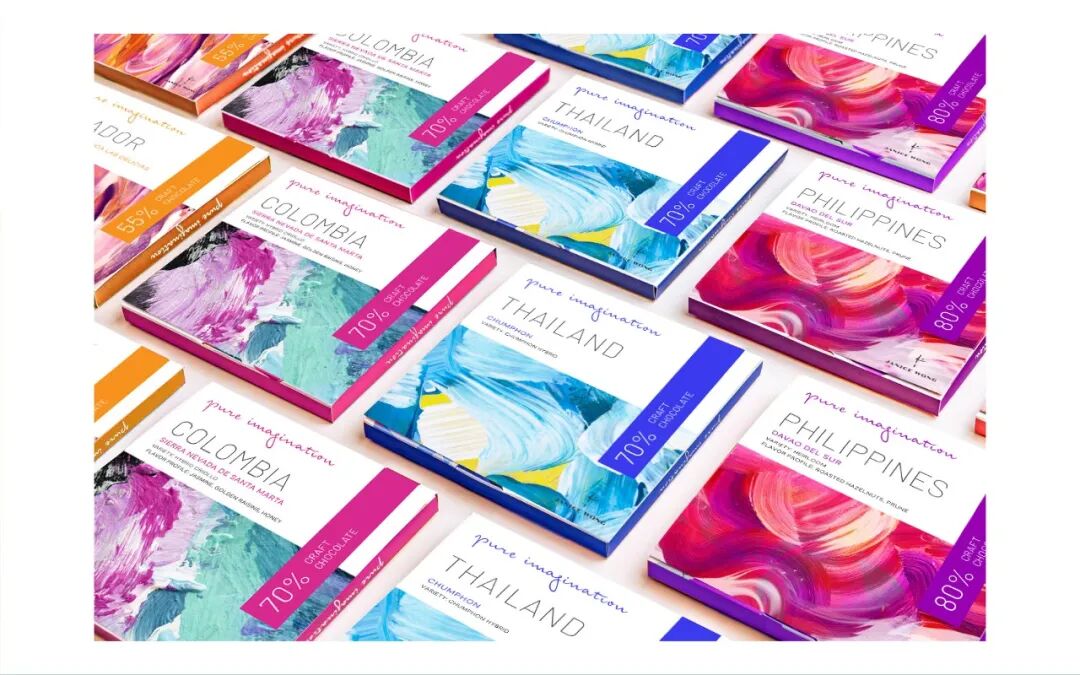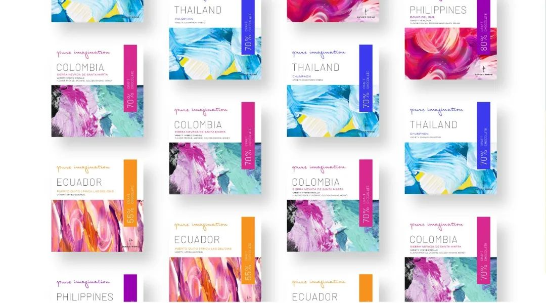 巧克力包装反映了可可产地的工艺和独特的文化,每个产地都与一幅抽象的油画和一种明亮的颜色相结合。