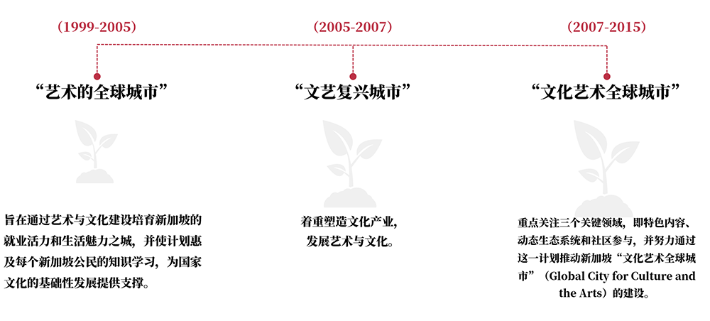 先后推出《文艺复兴城市2.0》(培养创意人才与观众)、《设计新加坡》(设计促进创新与经济)、《媒体21》(新加坡作为国际化的媒体中心)、《创意产业发展战略》等等一系列文化发展战略。