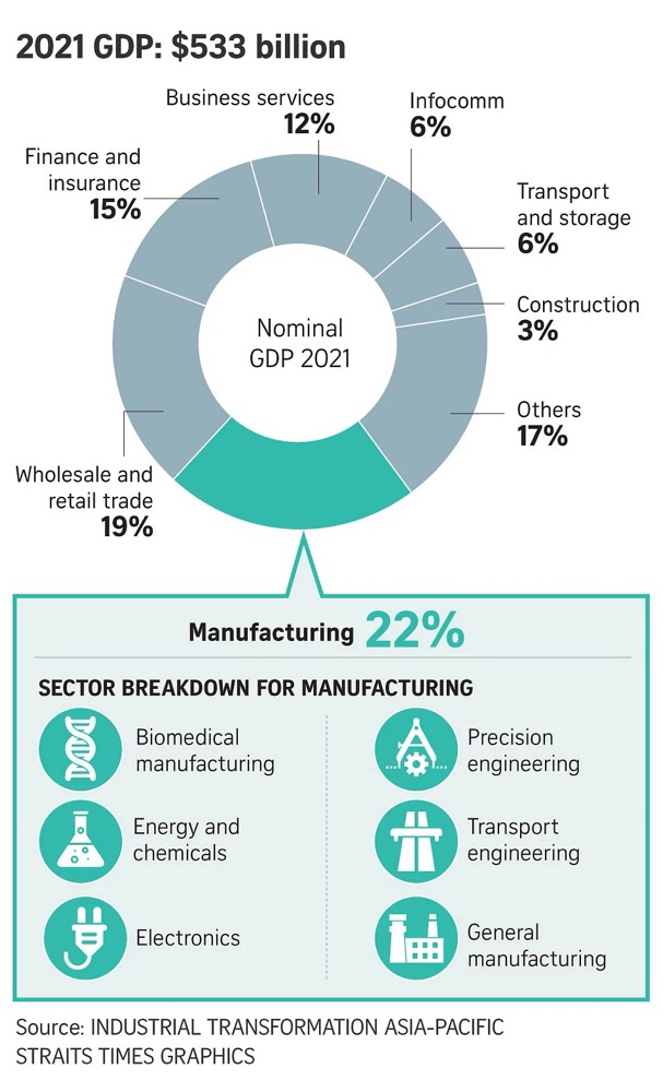数据显示,新加坡的制造业贡献了GDP的 21% 左右,吸纳了13.5%的劳动力。而在当今竞争日益激烈的当下,新加坡将“先进制造业”做为重点发力点,在“制造业2030”中指出,到 2030 年力争将新加坡的制造业产值增长 50%,重点是生物医学电子和精密工程等子行业。