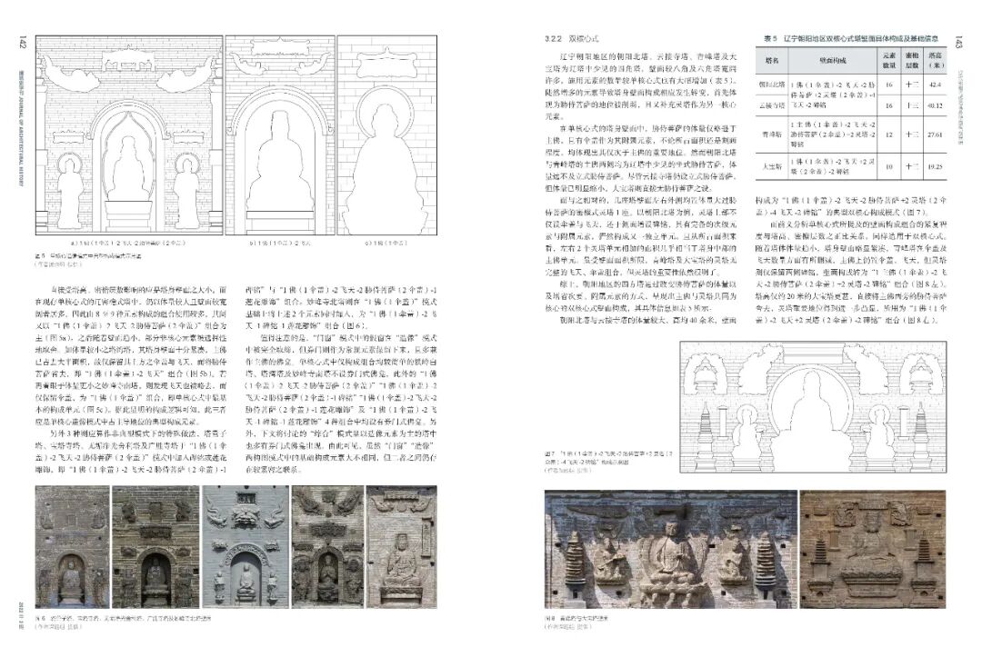 王贵祥的《北魏洛阳永宁寺塔可能原状再探讨》是作者对北魏洛阳永宁寺塔的第二次复原研究。文章回顾了永宁寺塔复原研究的学术史,并重点阐释了作者对永宁寺塔的两种复原新思路,即分别以“基于数字‘七’的比例权衡”和“基于数字‘九’的比例再权衡”进行复原:前者以3.5丈、7丈为主要模数控制塔身立、剖面;后者考虑到数字9在永宁寺塔中重要的象征意义,以3.6丈、7.2丈和4.9丈为主要控制模数。在永宁寺塔的相关数据极其缺乏的情况下,利用文献记载和遗址实测中找到的重要数字信息,结合传统建筑的构图比例及数术内涵进行复原研究,不失为一种富于启发性的探索。刘畅、李大卫、李泽辉、赵寿堂的《算法在儒匠之间:应县木塔平面丈尺假说续论》是作者团队对应县木塔尺度研究的又一阶段性成果,通过对木塔的精细测绘,反思并从新的视角讨论了应县木塔八边形平面可能的设计方法——尤其是通过对铺作层的精细测绘,发现木塔八面面阔数值十分接近,与既往通过柱头平面数据(受变形影响较大)所反映的面阔数值相差较大的结果有着显著差别,直接启发了作者对于木塔八边形设计方法的探讨。高敏、王南、王卓男的《辽代密檐式砖塔塔身壁面构成探研》是该团队辽代佛塔研究课题的专题成果之一,选择52座辽代密檐塔为样本,对其塔身壁面构图展开系统研究,探讨了“门窗”及“造像”两大构图模式、进一步细分的一系列构图类型,以及这些构图背后所蕴含的地域性特征与构成逻辑。