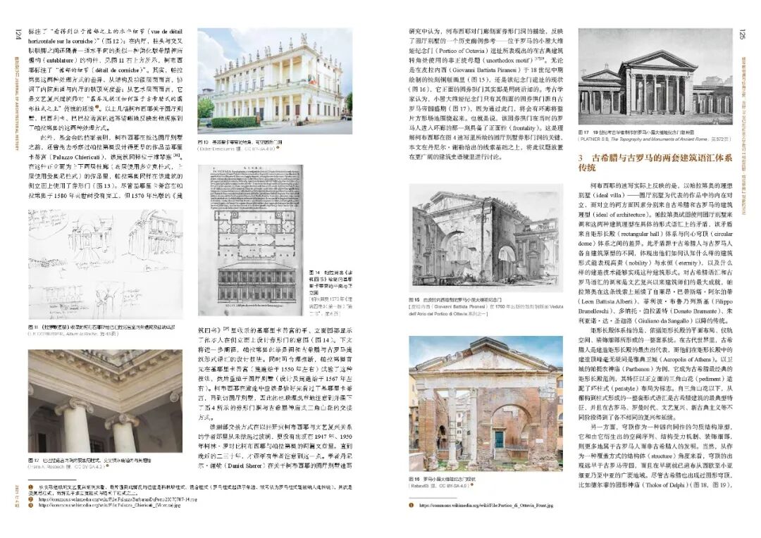 帕拉第奥对后世的影响跨越不同的语言和文化,从16世纪延续至今。《在帕拉第奥的阴影下:皮萨尼别墅和斯卡莫齐的世界》揭示了16世纪末期的意大利建筑师斯卡莫齐如何在继承和诠释帕拉第奥遗产的过程中发展自己的独立语言。《返璞归真:斯托海德花园的“帕拉第奥桥”》《蒙蒂切洛及其后续——帕拉第奥的乡村别墅在美国的继承与转译》则分别聚焦于18世纪前期的英国和18世纪末期至20 世纪初期的美国,通过对生动史实的挖掘,展现出帕拉第奥的古代建筑研究与建筑设计作品如何经由数次被称为“帕拉第奥主义”的运动而参与建构西方工业时代的理想古典景观。在“帕拉第奥主义”之后,帕拉第奥的影响仍在延续。《继承和转译:小议近代中国建筑中的帕拉第奥式遗产》从非西方的视角,讨论了帕拉第奥经由“布扎”体系对中国近代建筑的影响,而《维琴察相遇与转角之爱:反思20世纪形式主义学者对“柯布西耶- 帕拉第奥”现象的论述》则从现代性的视角,讨论了帕拉第奥应对不同古典建筑要素间矛盾时的创造性处理方式如何经由勒· 柯布西耶的观察、发现和创造而在20世纪现代主义建筑中重获新生。