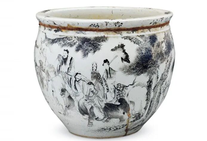 清代墨彩八仙神兽纹大缸,口折沿,鼓弧腹,腹下渐收,平底内凹,器身里外施白釉,平沿部为折枝竹叶纹,倒沿为梅花纹。瓷缸腹部饰主题纹饰,白地墨彩,绘图手法近似 “白描”。