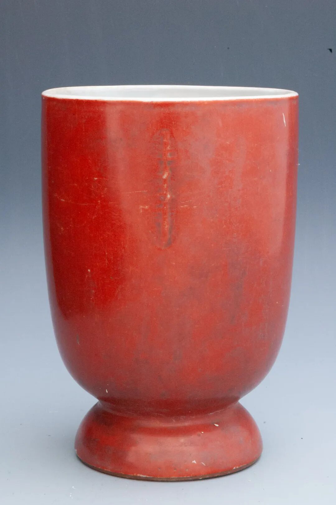 还有单色釉装饰品类,如清代矾红深腹高足杯,直口,直腹略收,高足外撇。外壁通体施单色红釉,釉色温润柔和,色彩鲜艳亮丽。胎体厚实,造型稳重。底部以红彩书 “湖南磁业公司” 六字两列竖式楷书款。
