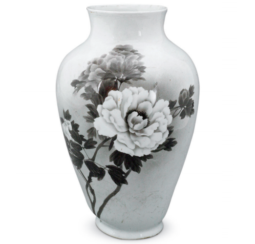 清代墨彩牡丹纹瓷瓶,口微侈,短颈,丰肩,深腹下敛,圈足外撇。通体施白釉,肩、腹部饰以釉下墨彩。