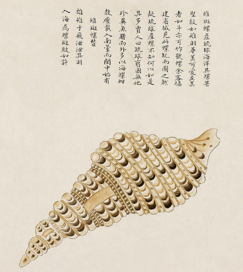 但纵观上述文献中出现的各种螺,可以确认为大法螺的是《海错图》中的“雉斑螺”,而没有一种可以确认为芋螺。聂璜对“雉斑螺”的描述如下:“产琉球海洋。其螺甚坚,纹如雉羽,华美可爱,至美者如斗,亦可作号螺。余客福建省城,见此螺,玩而图之,然疑琉球产螺不知何以如是其多,贾人曰:‘琉球穷国,无他珍异,鱼腊而外,多以海螺蚶壳压载入南台,而闽中始有。’”
