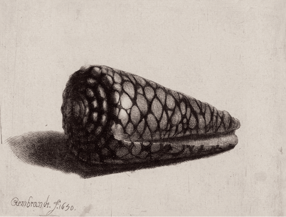 在描绘贝壳的静物画中,芋螺也有极高的出镜率。著名画家伦勃朗1650年专门为自己收藏的一件大理石芋螺(Conus marmoreus)创作了一幅铜版画。