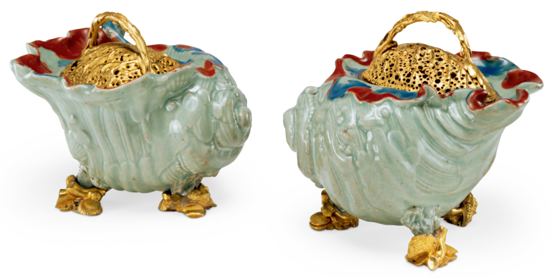A2、A3、B1、B3的功能则在镶嵌后转变为香熏(pot pourri),它们的共同点是在口沿上加装了镂空装饰带。此类设有镂孔的容器可存放芳香的干花,有时还要加入盐、香料、香水、精油等物与干花混合,这在 18 世纪的法国十分流行,或许和当时的巴黎臭气熏天有关,极具实用性。不少香熏即由东方瓷器镶嵌改装而成。A2加装的口沿和以茛苕叶为主体的底座是明显的洛可可风格。A3的镶嵌则较为简单。