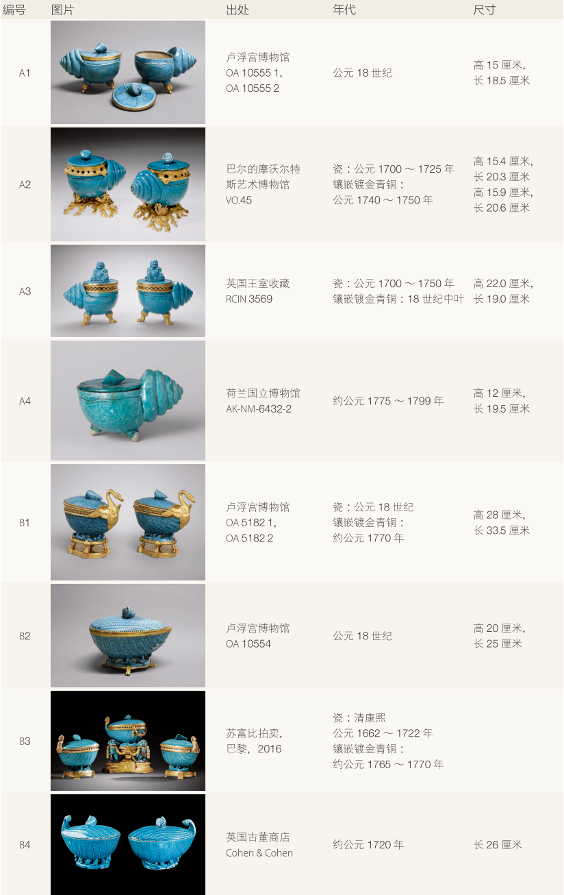 这些瓷器中,A1、B1〜B3可确定曾由法国人收藏,经镶嵌的器物也均为法国镶嵌,表明这批瓷器的目标市场很可能是法国,那里也的确是 18 世纪欧洲贝壳收藏的中心之一。