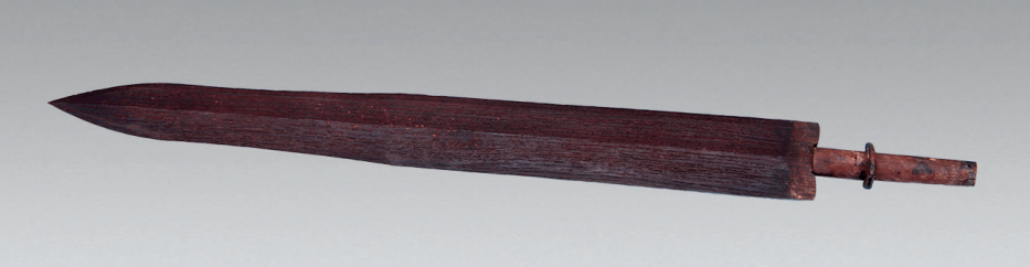 圆实茎剑,圆形或扁圆形实心茎, 茎上无箍、单箍或双箍,圆首,多凹形 格。剑身中间起脊或扁平,近锋处凹弧。见于靖安李洲坳东周墓、贵溪龙虎山崖 墓、大余宝珠山、樟树牛头山战国墓等, 分布广泛,数量众多。贵溪龙虎山崖墓 出土圆实茎剑 M2:15〔图 23〕,仿铜木剑, 圆茎单箍,带木鞘,鞘表留有黑漆残片, 出土时置于墓主左腋下,长 48 厘米。