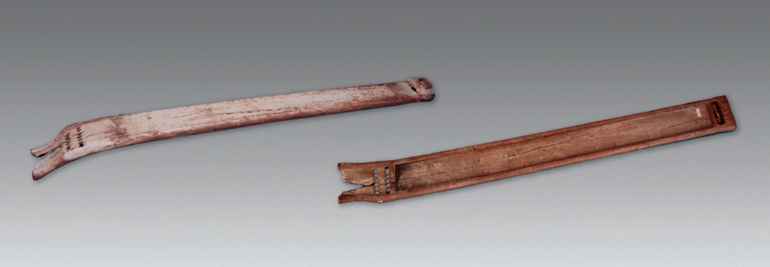 筝以整木制成,正面平整,背面下凹,隔成长方形音箱,筝首似鱼尾状,向下弯弧,内有一至二排弦孔,筝尾有一横凸起。见于贵溪龙虎山崖墓、樟树国字山战国墓和莲花桐鼓堆战国墓。贵溪龙虎山崖墓出土2件,出土时均置于棺盖,其中筝M2:17,筝首两排弦孔,长1.66米。