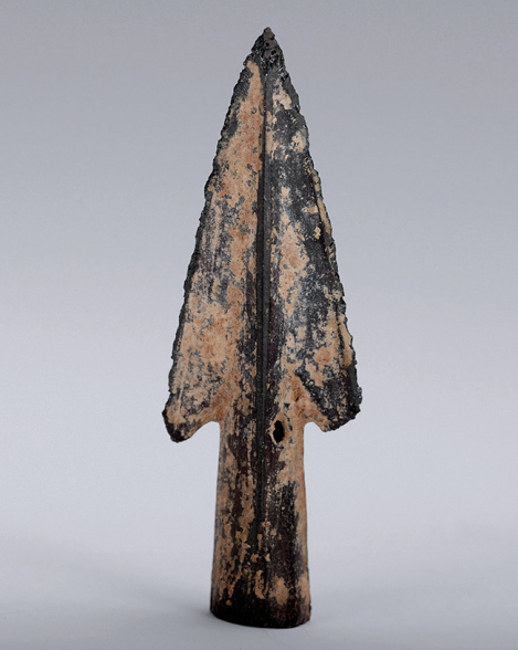 矛为长柄格斗兵器,由铜质矛头和木质长柄组成,出土时一般仅存矛头。青铜矛出土数量较多,以骹口平齐的窄叶矛最为普遍,如:广昌窖藏出土的7件,骹上有穿,叶中间突出细线状高脊,通长13〜15.9厘米;宜春坝上春秋墓葬所出矛M3:9,骹侧有半环形钮。而具有明显越系风格的是骹口呈燕尾式或深凹的燕尾矛,以大余宝珠山所出器例为代表,骹口成弧形内凹,长14.5厘米。