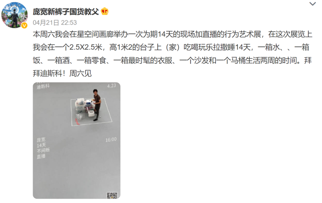 原来,就在昨日,新裤子乐队成员庞宽在星空间画廊举办了一场行为艺术展,他在画廊的一个2.5*2.5米的小台子上,将要生活14天,一箱水、一箱饭、一箱酒、一箱零食、一箱最时髦的衣服、一个沙发和一个马桶,将自己的吃喝拉撒睡全部直播展示给大家。