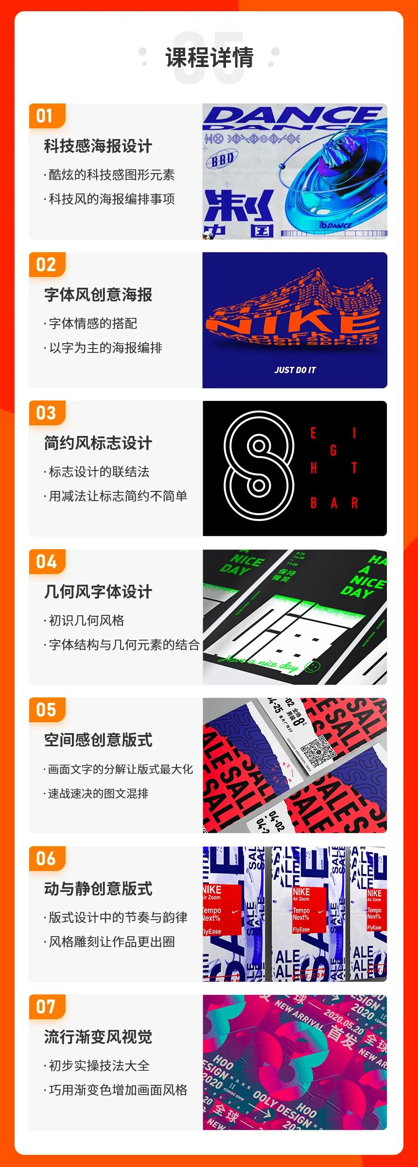 7天的时间,7节课程7个实战案例,老师带你学习科技风、纯文字风、简约风、几何风、空间感、动与静风格、流行渐变风7种创意风格设计,并在这些课程中,带大家了解版式编排、字体设计的一些技巧!