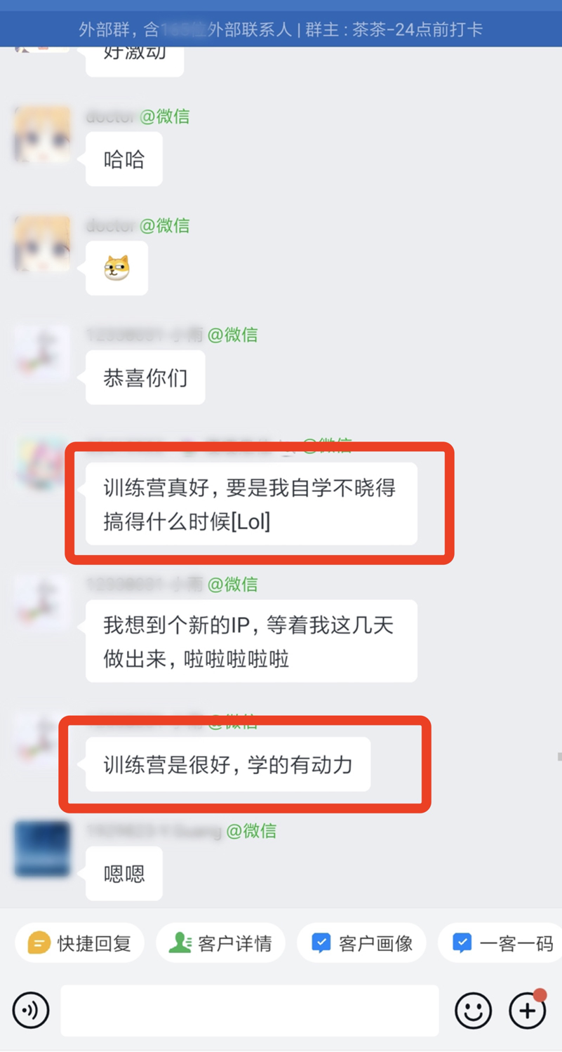 而且,我们陪练营群里的氛围特别好!大家会随时分享自己最近看到的好作品、在一起交流学习、互相鼓励!也有基础比较好的同学会帮忙回答大家的疑问,一起加油一起进步!