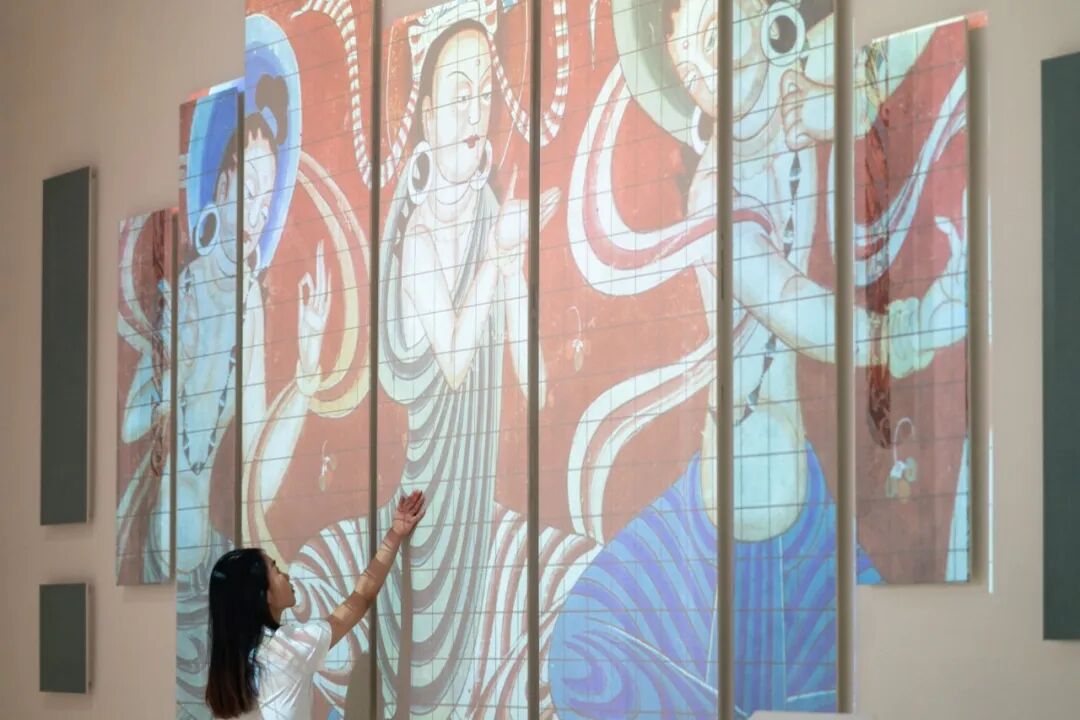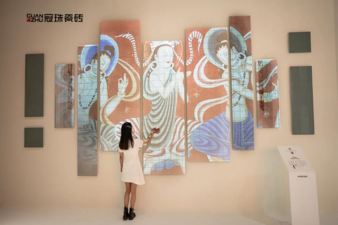 另外一个是以敦煌文化为主题的大板瓷砖产品,我们希望以后代守窑人的视觉,带领大家来到窑洞探寻我们的珍宝文化。探照灯在大板瓷砖上摇曳,就像守窑人因为怕电光毁坏千年壁画而长年用手电筒工作一样。探照灯引导大家,探寻触摸瓷砖,当指尖触摸一瞬间,满墙的千年瑰丽敦煌仙境壁画涌现,我们轻触停留仰望千年过往,感知到产品的由来和质感。这种以叙事性和互动性结合的手法可以有效传达出产品和人的连结。