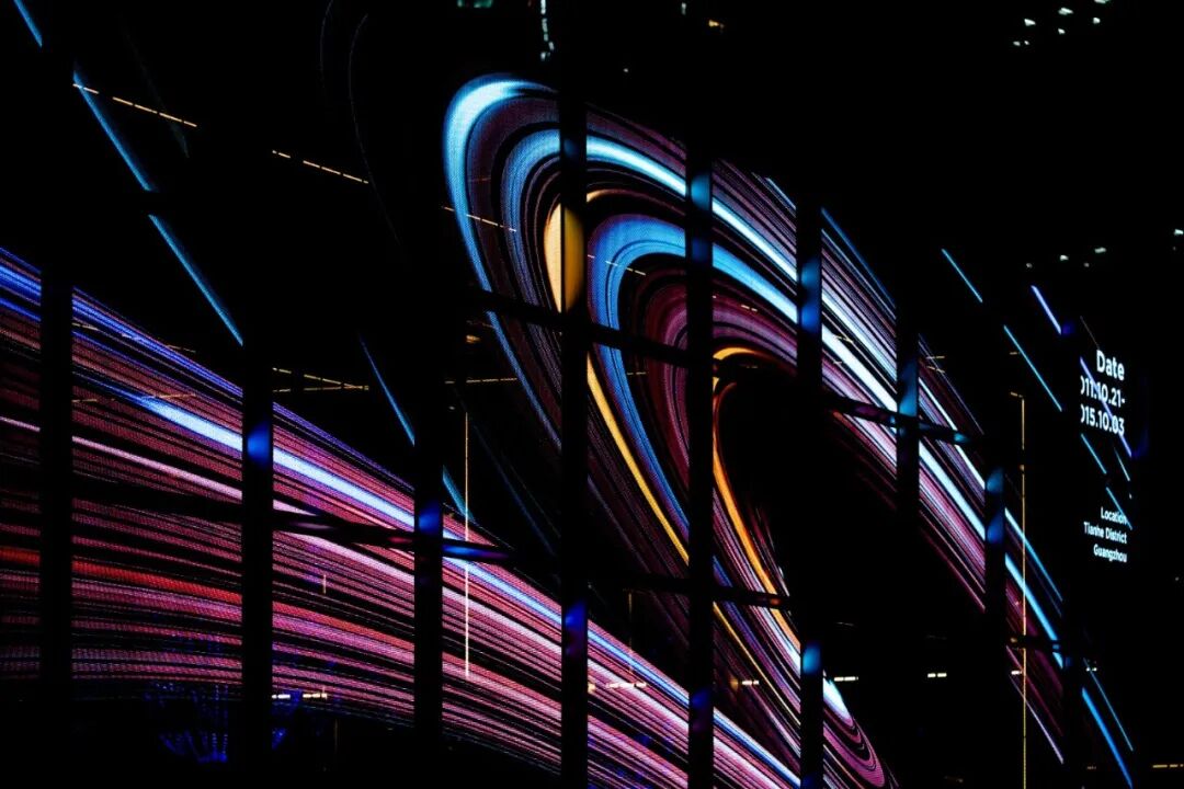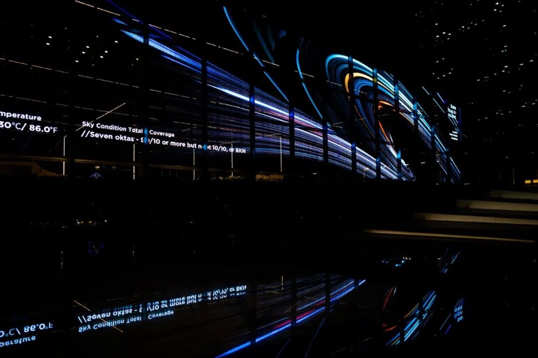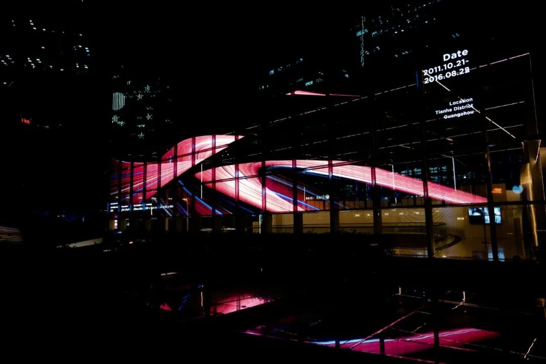 这些运动轨迹是基于太古汇地理位置以及开业以来十年的自然数据变量,采集后通过数据可视化,呈现出不断更迭的演变。每一秒的画面都是根据数据产生变化,具有独特的意义,就像有一句浪漫的英文诗:“I remember that is wonderful as soon as fickers, appeared you in mine front”(我记得那个美妙的瞬间,就是你在我眼前)。希望给大家带来独特的体验。