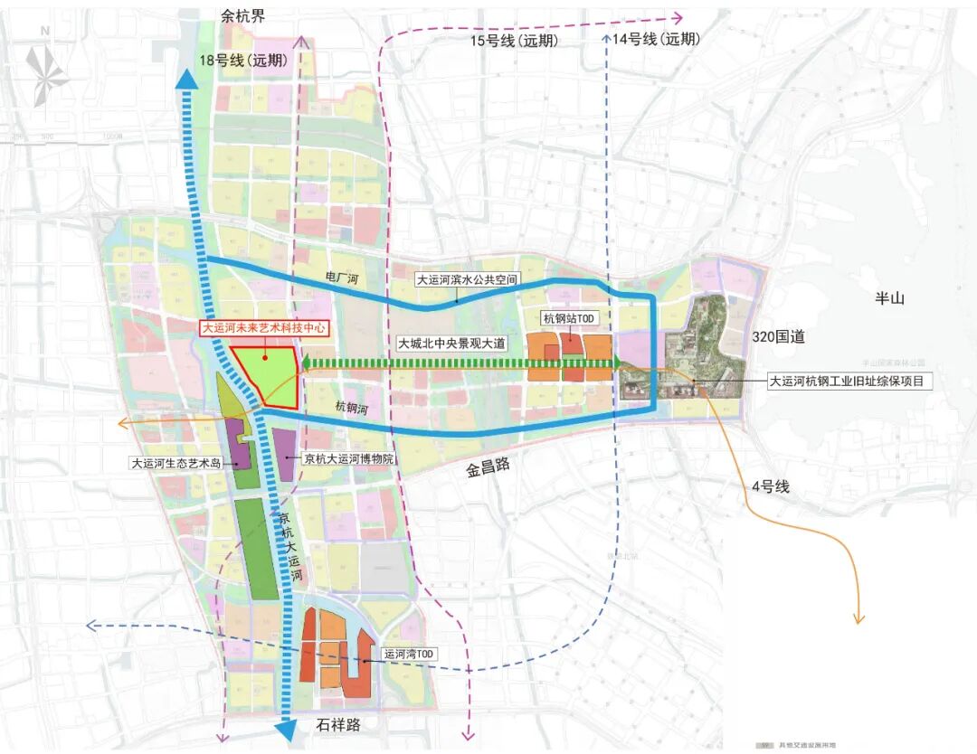 大运河未来艺术科技中心位于杭州运河新城的核心区域,西临京杭大运河,南临杭钢河。原为杭州炼油厂,占地17.56公顷。作为“大运河世界文化遗产公园”标志性项目之一,大运河未来艺术科技中心包括艺术科技馆、国际创意产业园、艺文创意街区和炼油厂公园,将被整体打造为“城市T台,未来中心”,成为时尚艺术的城市公共文化客厅和新兴未来产业集聚地。