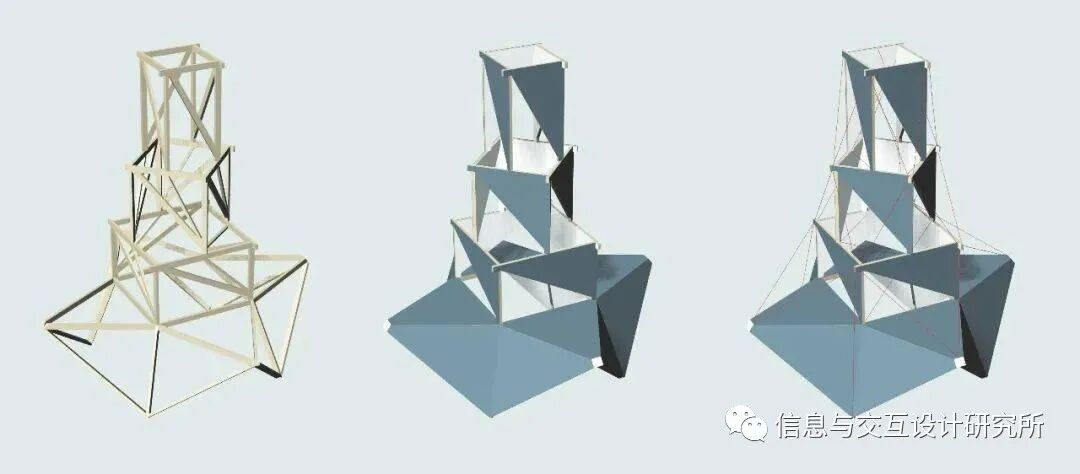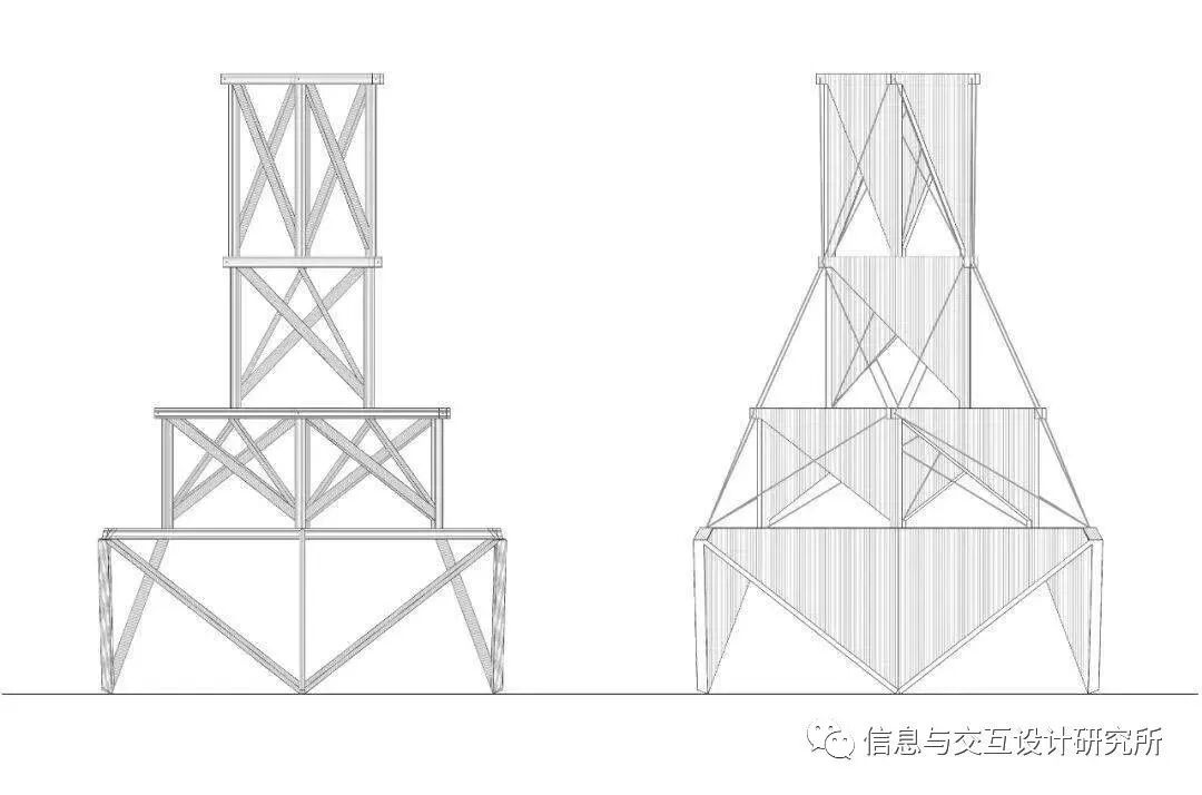 本次作品被命名为“玄鸟火塔”,也因为火塔的整体形态中,板片如同飞鸟的羽翼,而钢制拉索如同苗族锦鸡舞中表现锦鸡尾羽的锦带。但玄鸟火塔在建筑语言的选择上与去年的入木火塘不同,本次采用了板片的建筑语言。三角形的板片旋转上升,板片之间的连接做到极少。塔身内外的拉索系统,结构上通过拉结保证了火塔的稳定性和整体感,视觉上也同时勾勒出了如侗族鼓楼般的廓形。