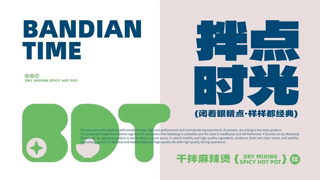 拌点时光干拌麻辣烫品牌,打破消费者对麻辣烫不健康、门店传统老式的固有认知,主打干拌麻辣烫,招牌产品为秘制拌酱+秘制麻酱,精选健康优质的食材,出品新鲜干净,为用户提供口味优异、性价比高的产品和贴心的用餐体验。