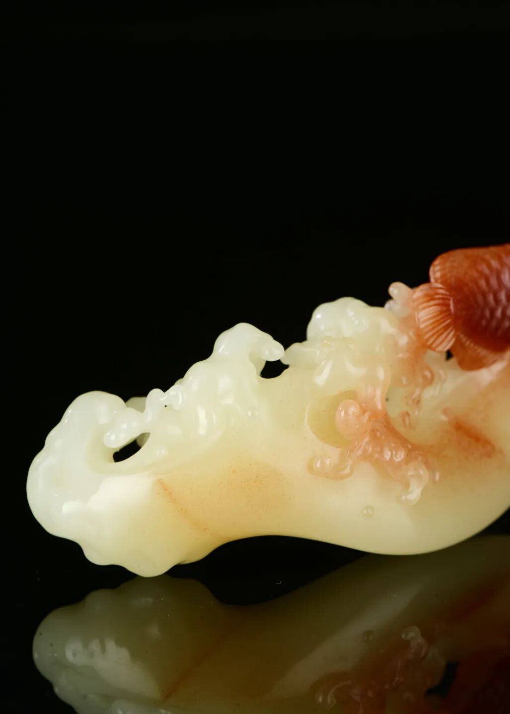 其中一点黑色本为令人烦恶的杂质,在他的巧妙设计之下却成为了令人拍案叫绝的点睛之笔。鱼鳞片片清晰,鱼鳍微微上扬,鱼尾隐隐发力,似有一跃而上的态势,石中暗头斑点桃花颗粒,在灯光的照射下波光粼粼,尤为灵动。又取纯白色部分做海中之浪,相较于金龙鱼的写实,海浪部分的处理却尤为写意,以流畅简练地线条勾勒出海浪翻腾之势,并无做过多繁杂细碎的修饰,此为虚实结合,反倒令整件作品的气韵更上一楼。