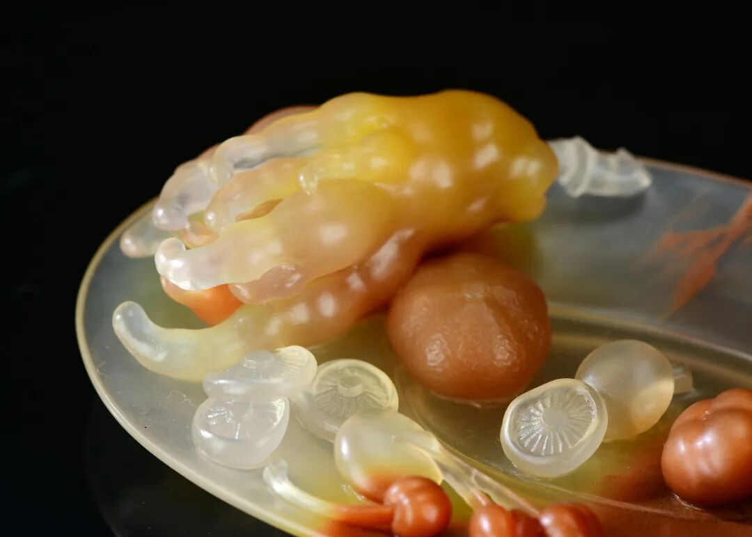 此作体量不盈握,最薄之处不过几毫,在如此小巧的空间内,化石体为盘子,红黄白三色互为巧色,其中有以浓郁纯红为巧色的柿子和樱桃错落散摆于盘子上,色彩诱人垂涎欲滴;又有下红上黄渐变自然的寿桃,宛若刚从数上采撷下的半熟桃子;又有介于红黄之间夹生的橘色巧妙地被刻为一枚福橘;以剔透白色刻成的香菇;三色皆有的佛手瓜。