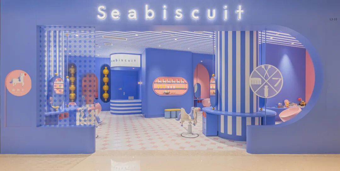 炘儒设计为 seabiscuit 海饼干打造的这家上海门店,将童趣的配色,圆润的几何波点、条纹元素,定制海饼干卡通小马理发椅,休息座椅等融合在一起,营造出一种童趣的二维卡通世界。