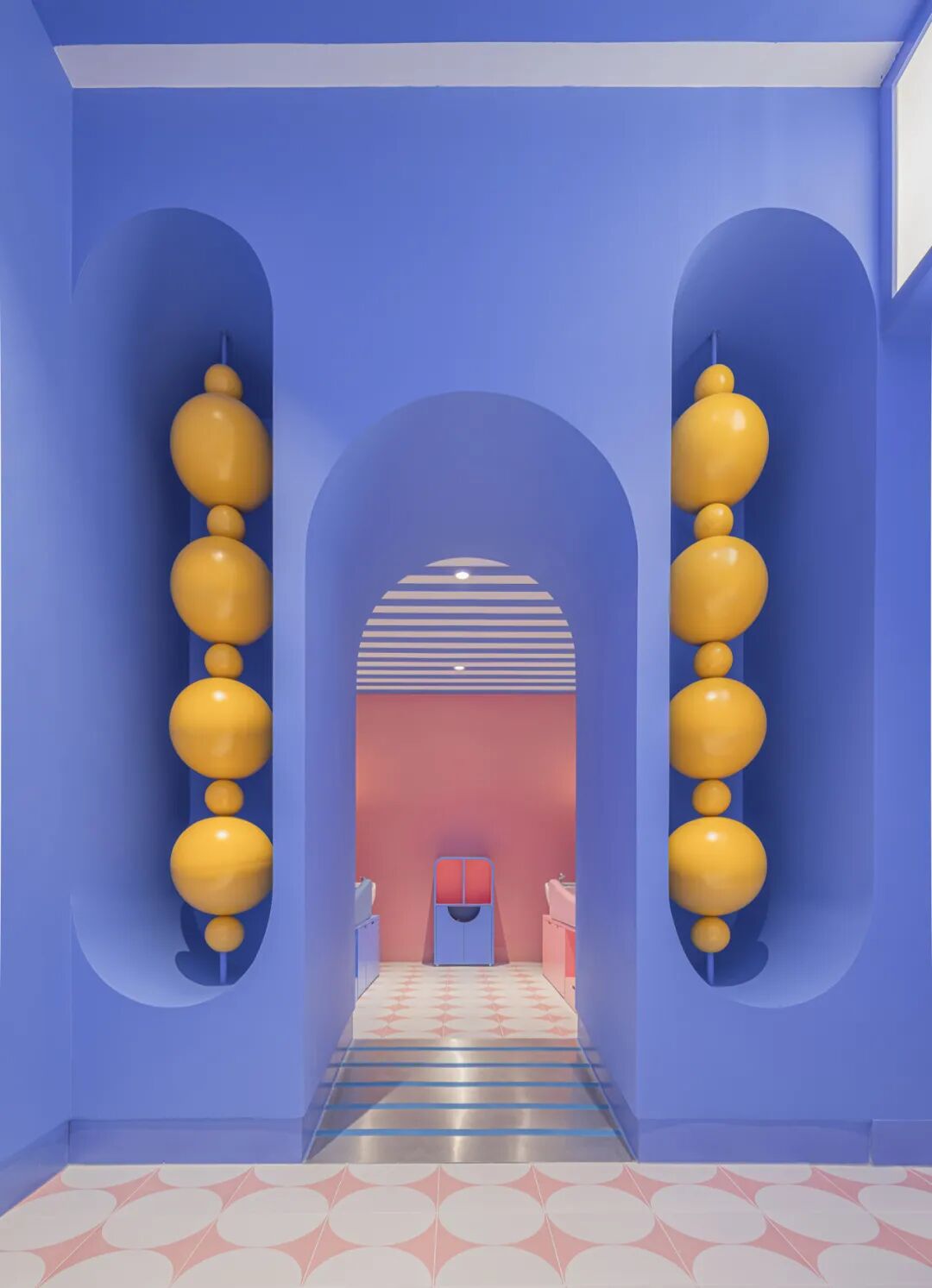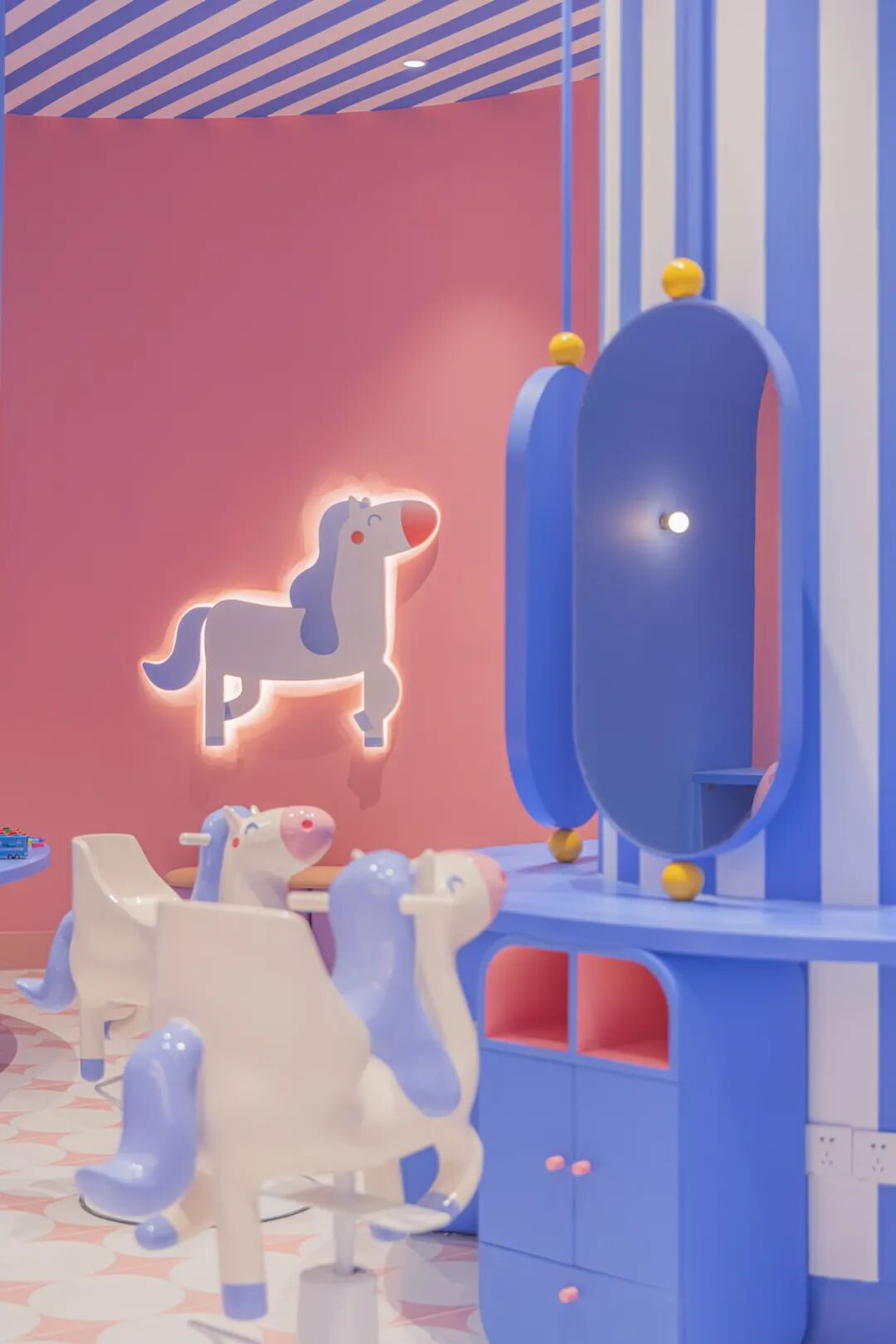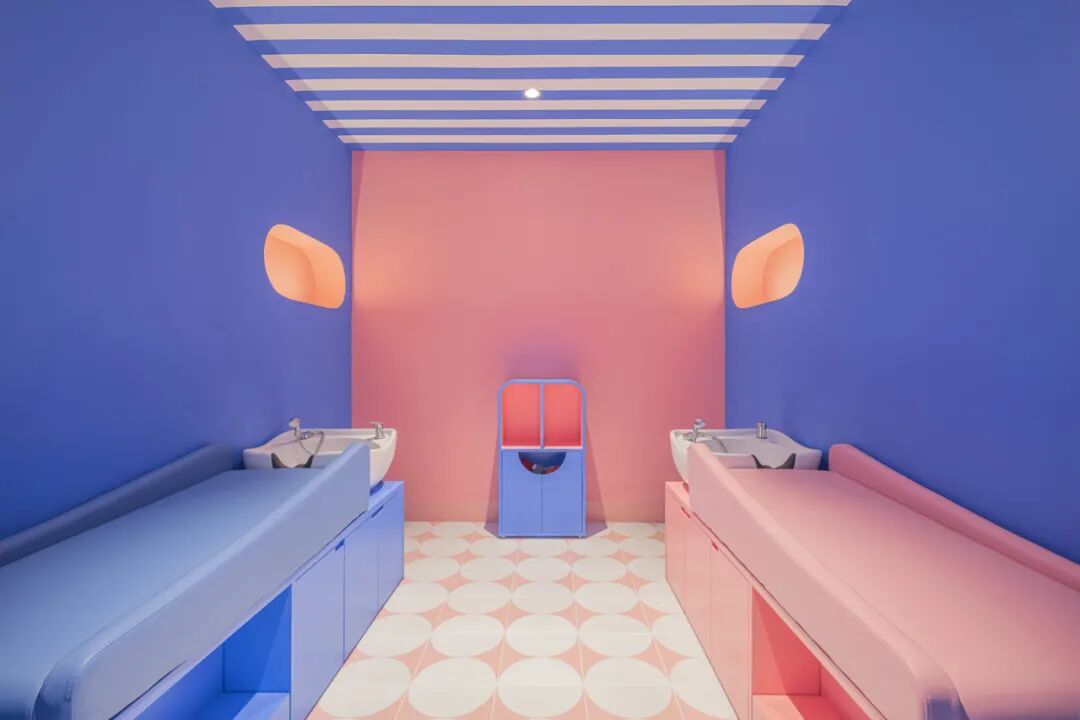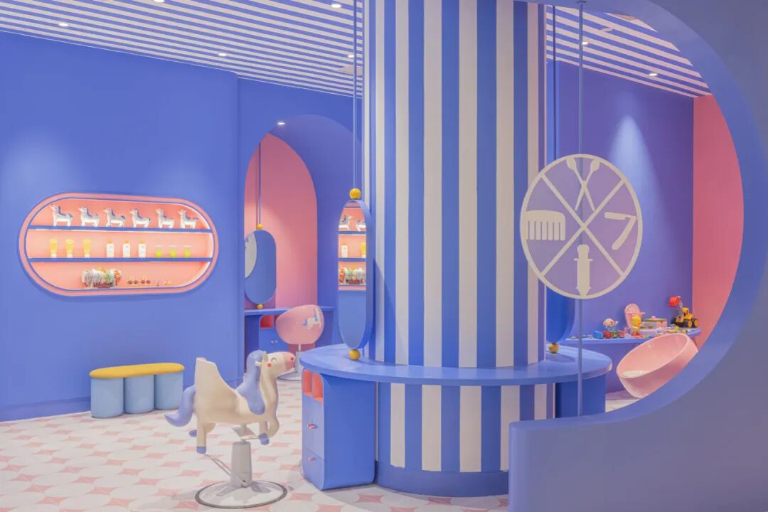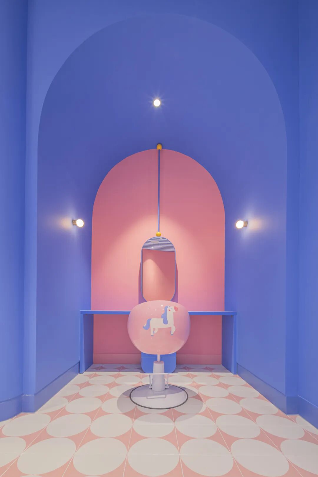 炘儒设计用圆润的波点和条纹,设计了这间充满卡通风格的美发沙龙