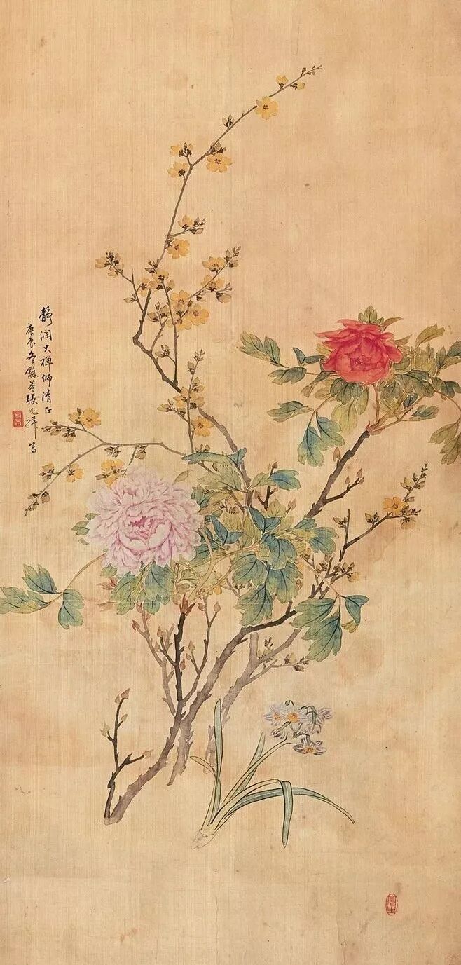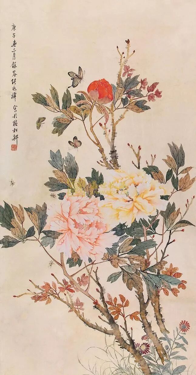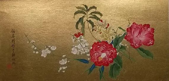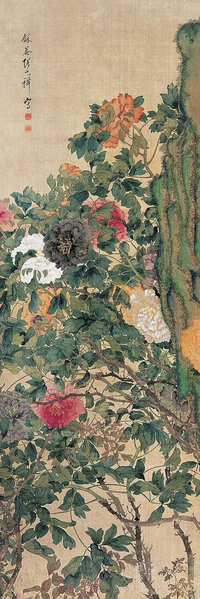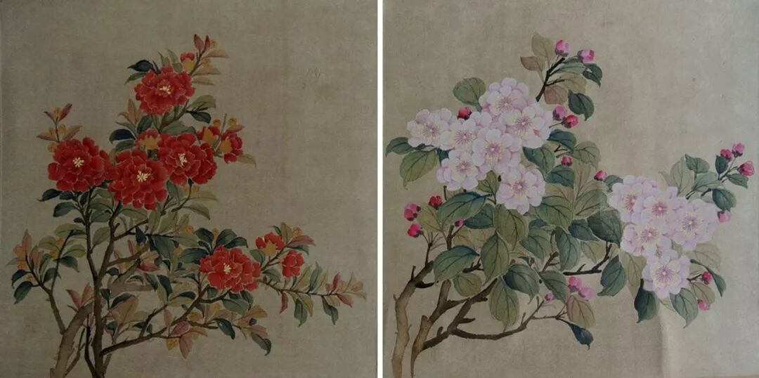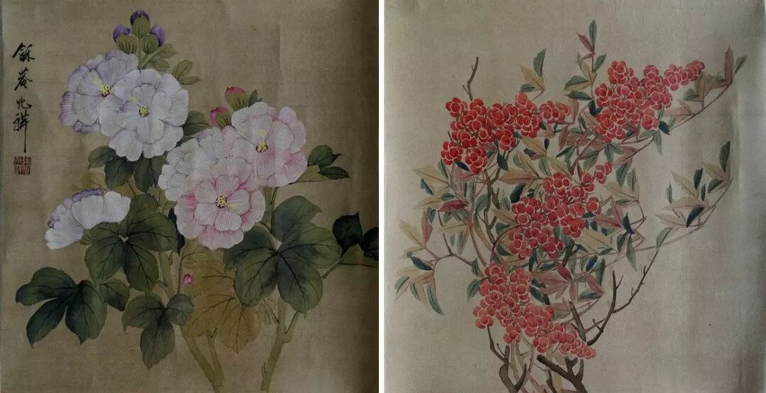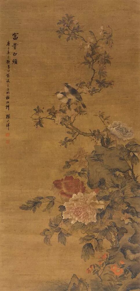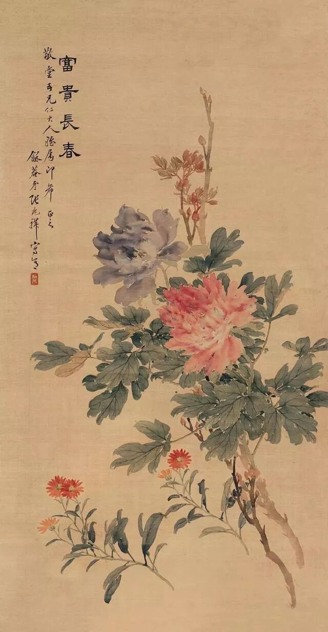 他的设色花鸟画,多有一种富贵祥和之气,姹紫嫣红,色彩绚丽,雅俗共赏,令人悦目。除工笔画外,偶尔也泼墨写意,笔墨间又透露出些许文人画的气息。