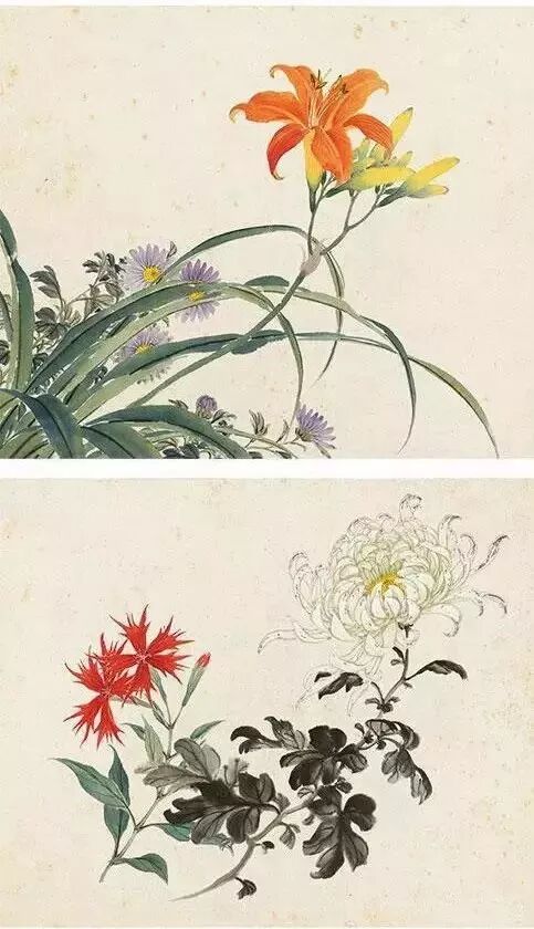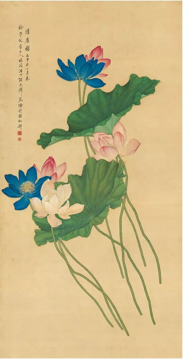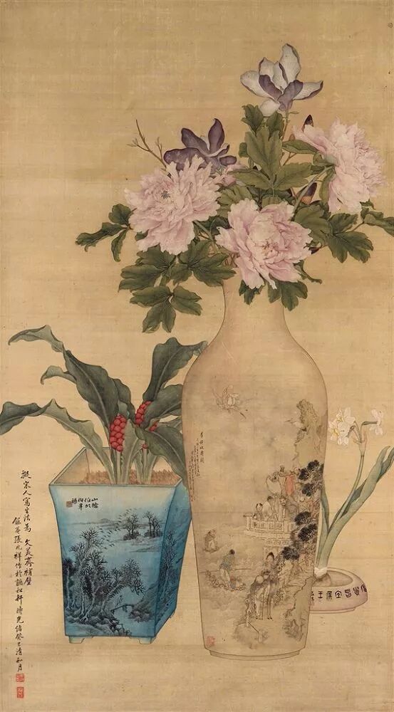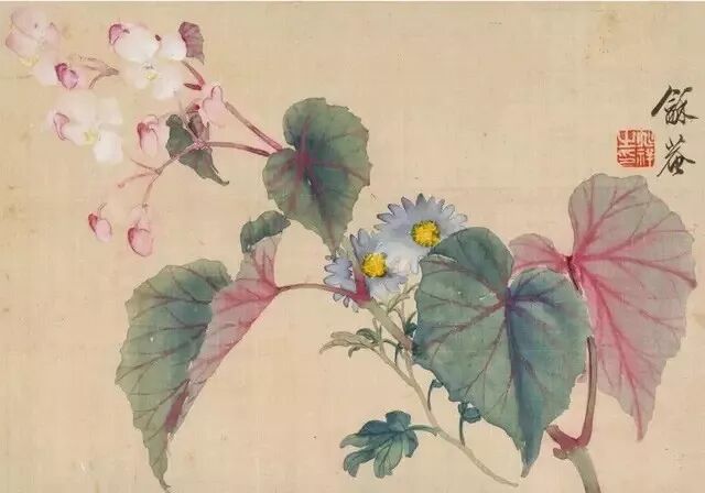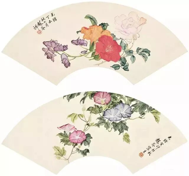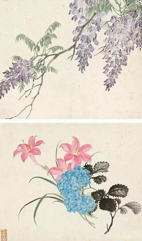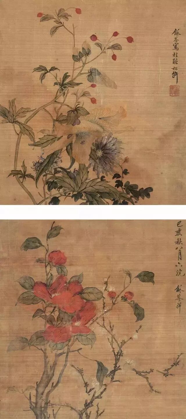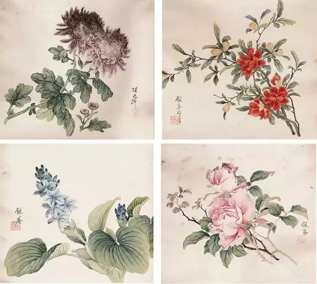 在颜料的选择上也十分考究,据说他曾短期受聘于如意馆,得到了一些赏赐,即民间部已得到的名贵颜料,颜色的制作也非常精细。