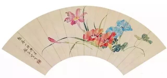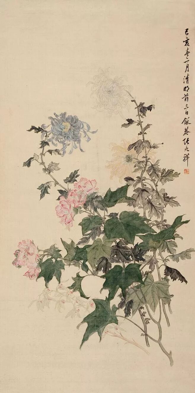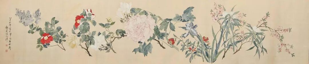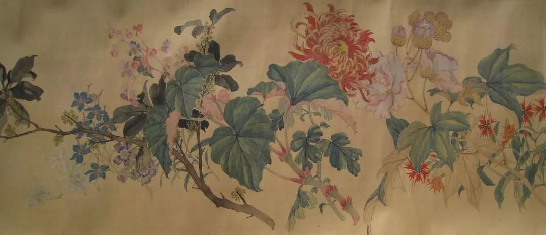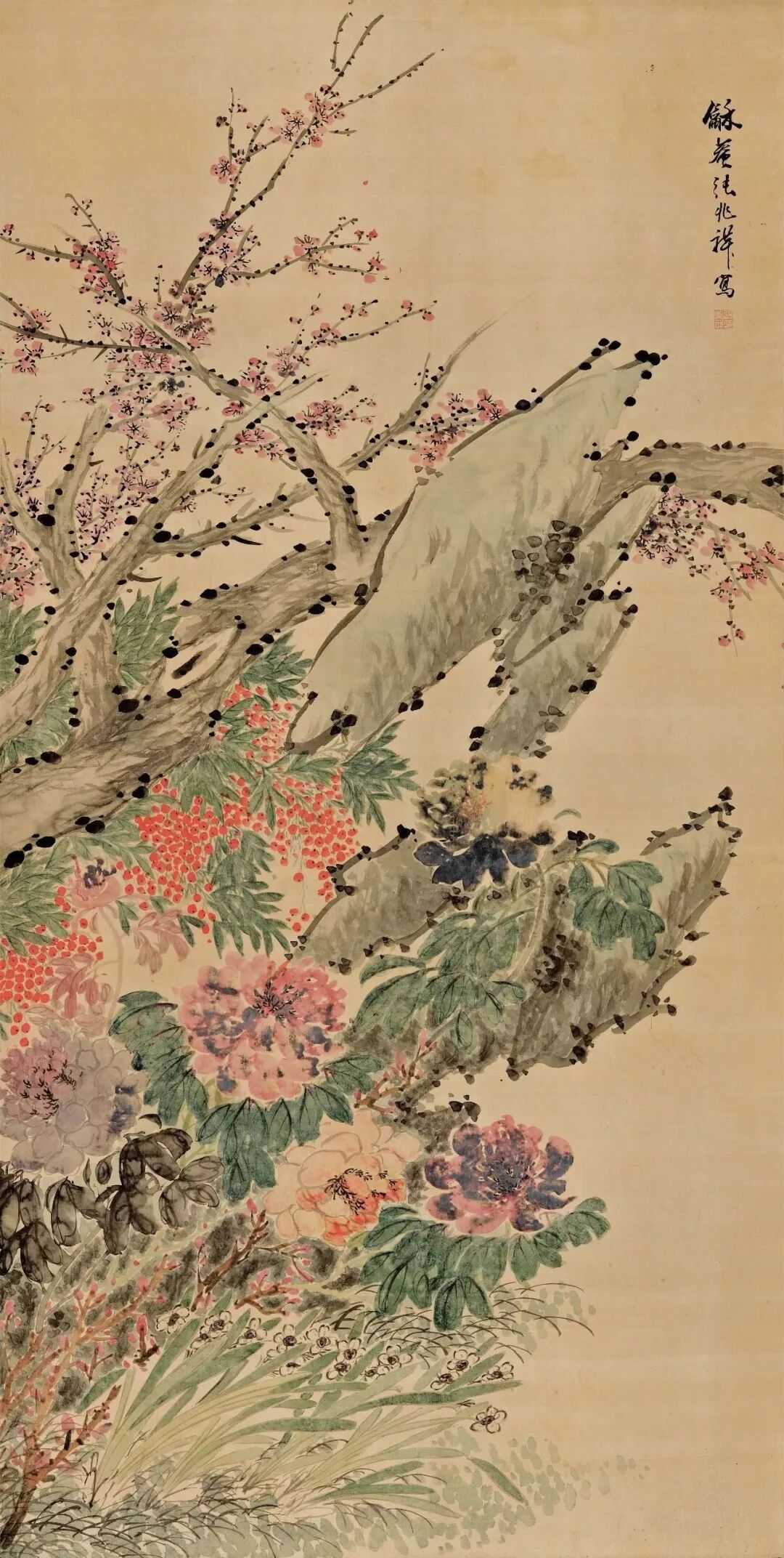 《蔬果折卉图》,为其光绪五年(1879)28岁时的早期力作;以没骨法作彩色小写意,描绘樱桃、枇杷、白菜、萝卜、牡丹、菊花等蔬果花卉几十种,活鲜鲜,水汪汪,设色妍雅,极备工致,可见其功力不薄。