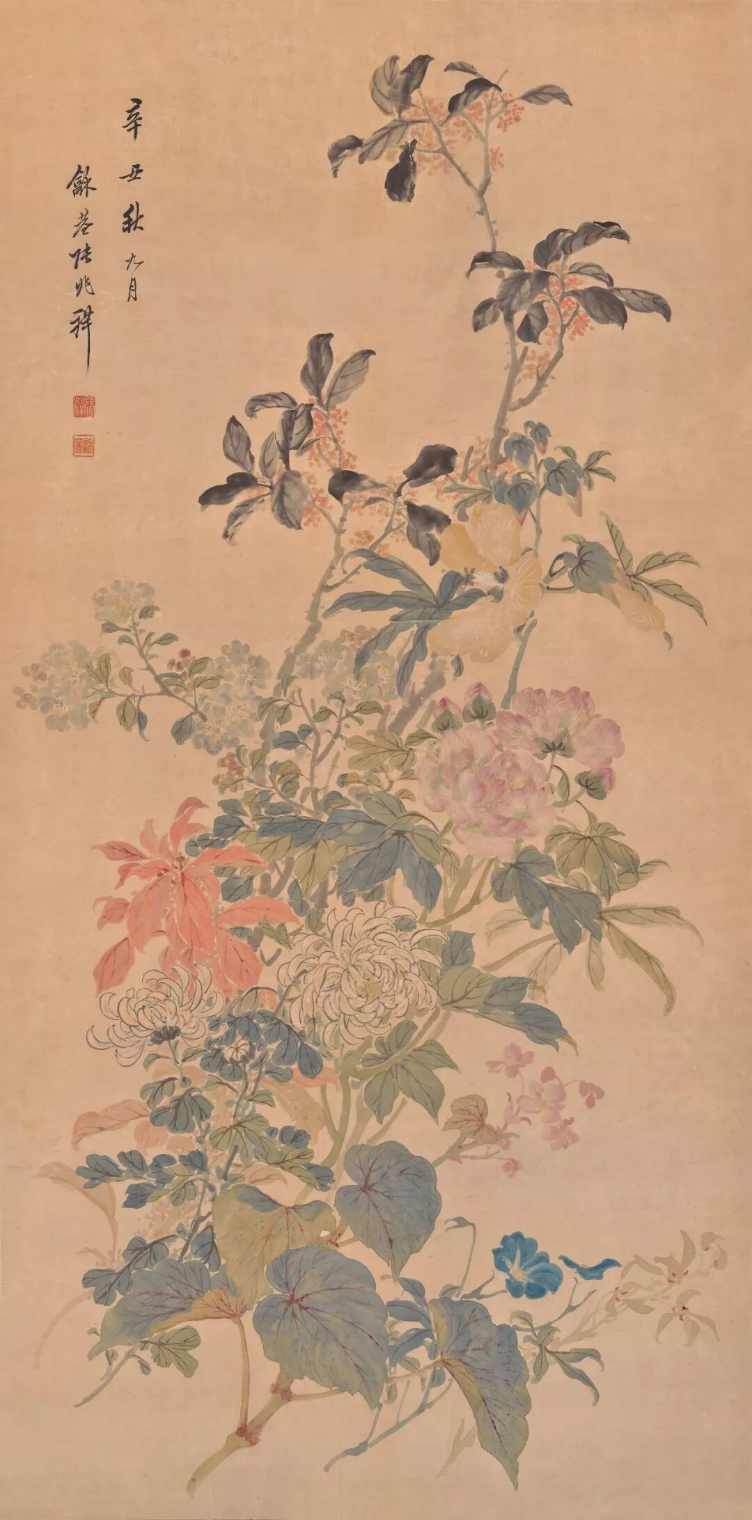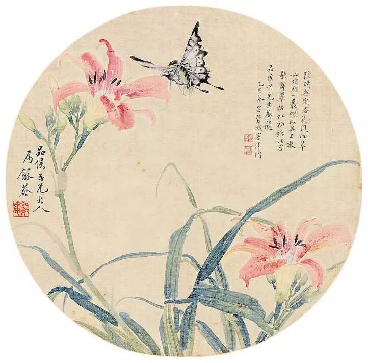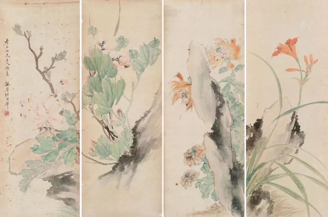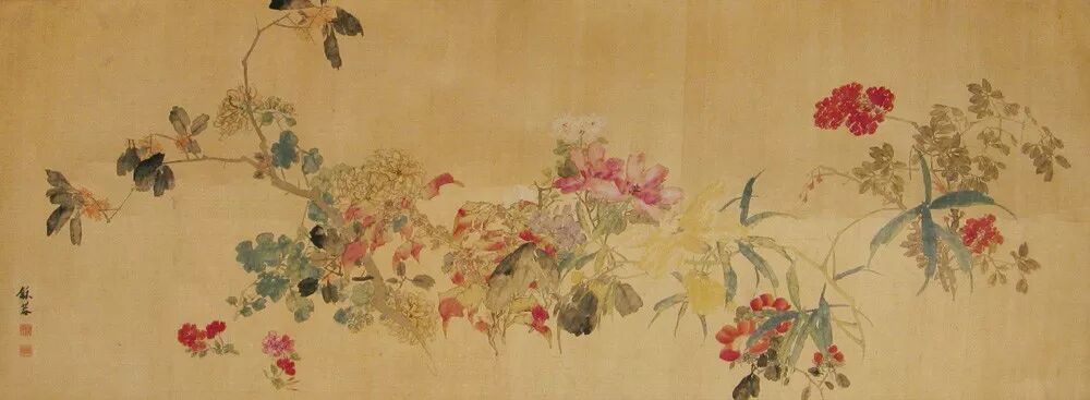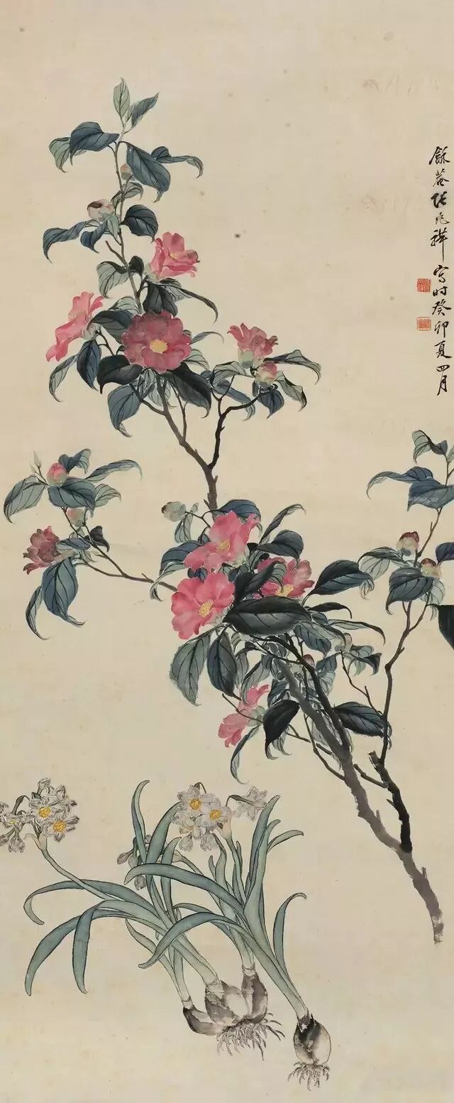 《蔬果折卉图》,为其光绪五年(1879)28岁时的早期力作;以没骨法作彩色小写意,描绘樱桃、枇杷、白菜、萝卜、牡丹、菊花等蔬果花卉几十种,活鲜鲜,水汪汪,设色妍雅,极备工致,可见其功力不薄。