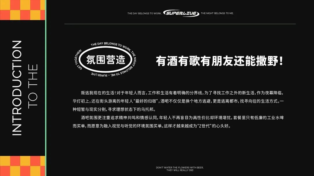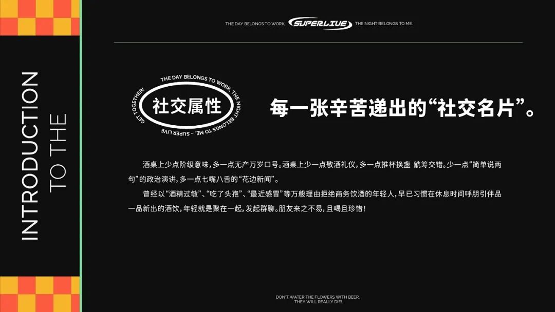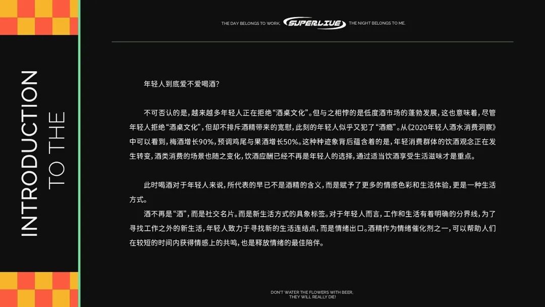 此时喝酒对于年轻人来说,所代表的早已不是酒精的含义,而是赋予了更多的情感色彩和生活体验,更是一种生活方式。酒不再是“酒”,而是社交名片、是新生活方式的具象标签。对于年轻人而言,工作和生活有着明确的分界线,为了寻找工作之外的新生活,年轻人致力于寻找新的生活连结点,而是情绪出口。酒精作为情绪催化剂之一,可以帮助人们在较短的时间内获得情感上的共鸣,也是释放情绪的最佳陪伴。