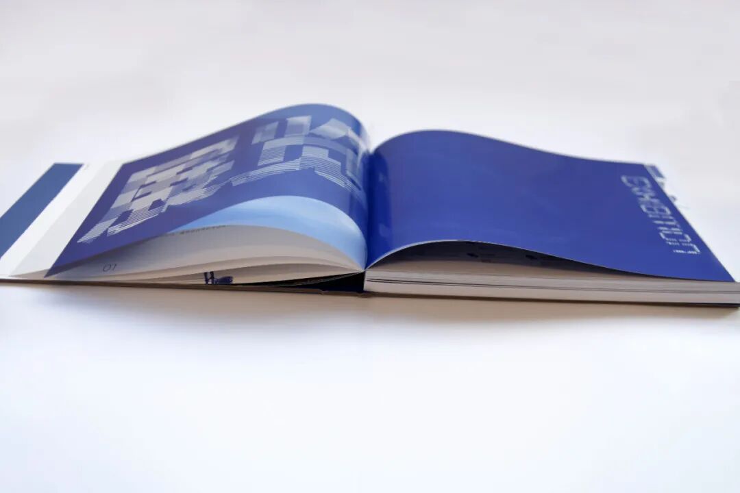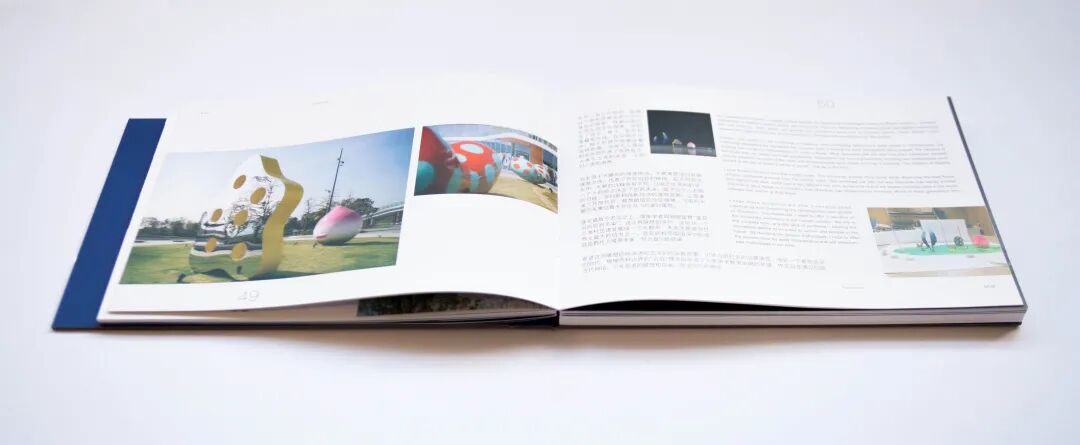 封面设计则用矩形方块展现了时间的秩序,沿袭了金唱片以特殊符号展现文明的形式。画册即理想化的⾦唱⽚,装帧设计成硬壳裸脊的精装包裹着书芯,打开书本后仍保留蓝⾊主⾊底的设计。