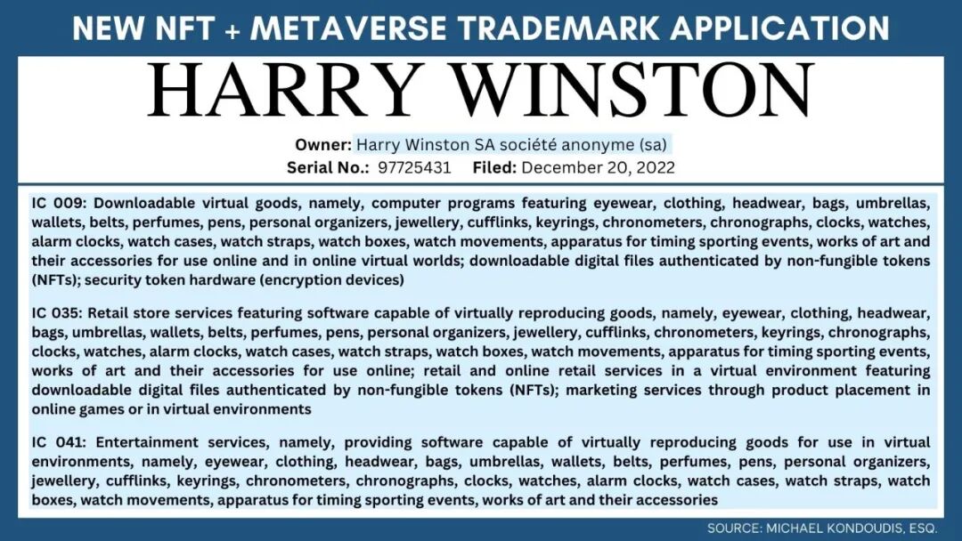 享有“钻石之王”美誉的美国珠宝品牌 Harry Winston 于 2022 年 12 月 27 日注册了提交了与 NFT 和元宇宙相关的商标注册。根据律师 Mike Kondoudis 在推特上发布的信息,该品牌提交注册的产品和服务包括虚拟服饰、珠宝、眼镜、手表、虚拟商铺,以及由 NFT 技术支持的媒体等等。