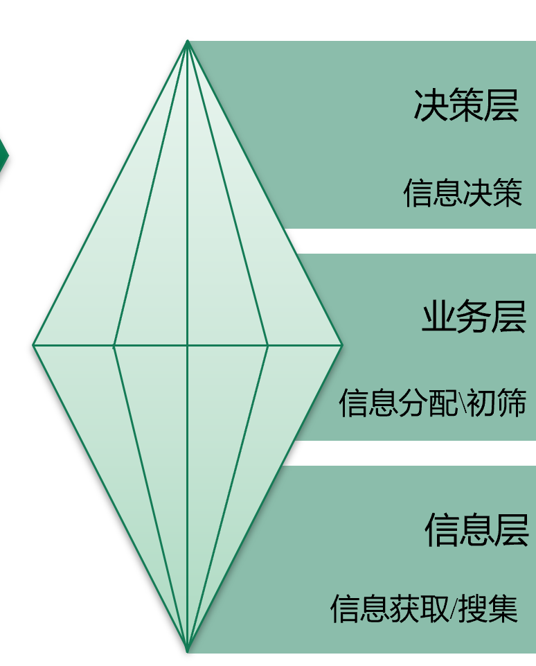 具体来说,钻石型市场组织结构由下自上包括信息层、业务层、决策层。信息层负责市场上项目信息的获取和搜集,要在区域经营网络合理布局的基础上,做深做广,最大程度捕获市场项目信息,同时整合不同业务条线的经营网络,减少市场资源浪费和避免经营网点的重复建设,但对市场前端人员的综合素质能力要求较高。业务层负责信息分配和初步筛选,获取后的信息根据固定规则分发至不同条线的业务单位,再由业务层进行初步筛选。决策层负责项目审批和市场信息决策,各业务层上报信息后,决策层在经过不超过四层的决策后做出最终结算。